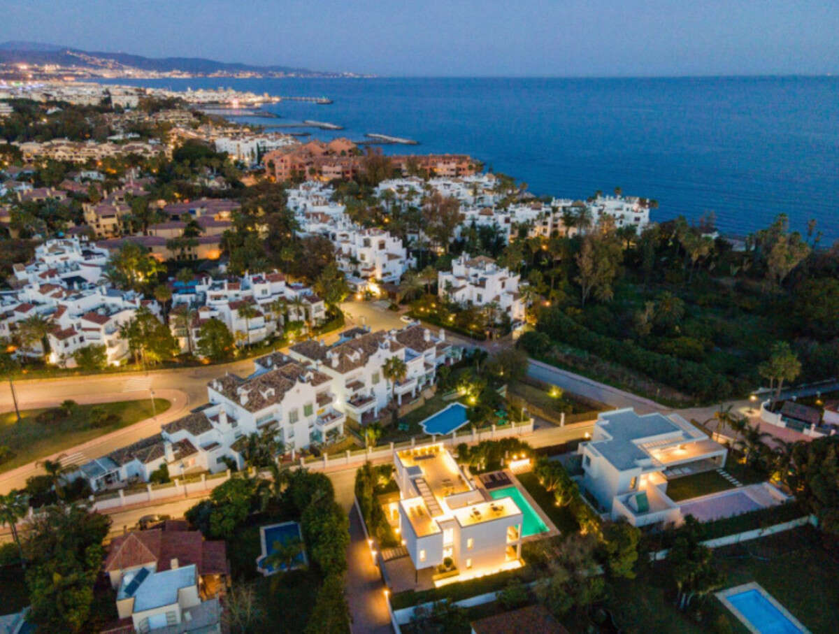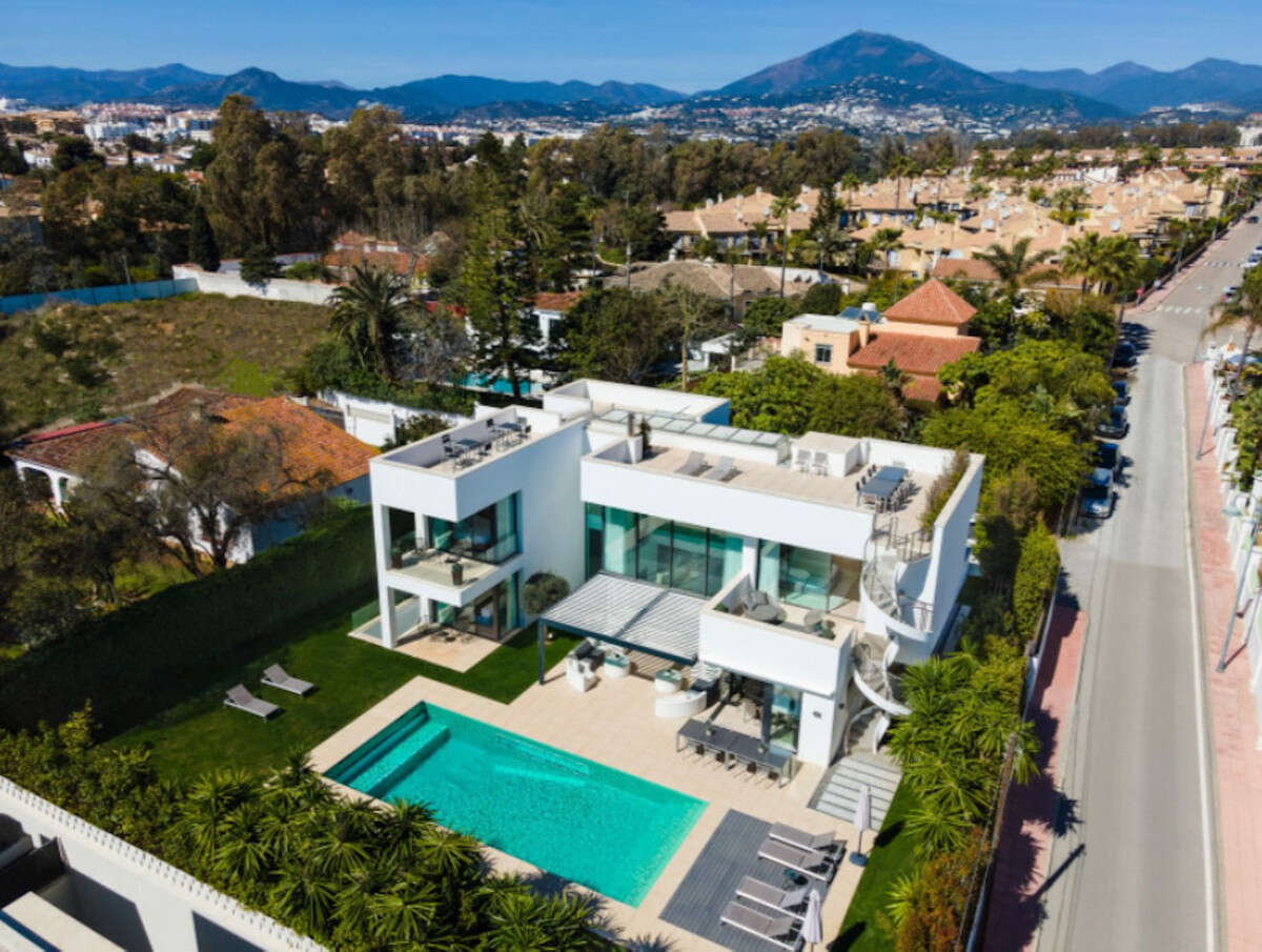 This contemporary villa provides the ultimate in beach side luxury living. Located in the beautiful beachside resort of Puerto Banus, 200 meters walking distance to the beach, close to shops and nightlife of Puerto Banus and short driving distance from Marbella centre and San Pedro. Designed across 3 floors, all accessible through the private elevator, the property offers 7 bedrooms and 7 bathrooms each with an outdoor terrace. Entrance level boasts of a large airy open plan living with double height ceilings. Welcoming exteriors include a manicured garden which surrounds the 54m2 salt water heated pool, cosy lounge areas, an outdoor dining area completed with its own outdoor kitchen and BBQ area for al fresco dining. On the first floor you will find 3 en-suite bedrooms and a hanging gallery overlooking the impressive lounge area. The generous master suite is completed with a walk-in shower, stand alone bath and an expansive walk-in wardrobe. A large outdoor sun terrace overlooks the pool and garden with access to the roof terrace. An expansive area with 3 separate terraces, giving you even more options for sunbathing and dining, while enjoying the breathtaking Sea and Mountain views. The basement has been converted into the perfect relaxation area, equipped with a cinema room and a games lounge.