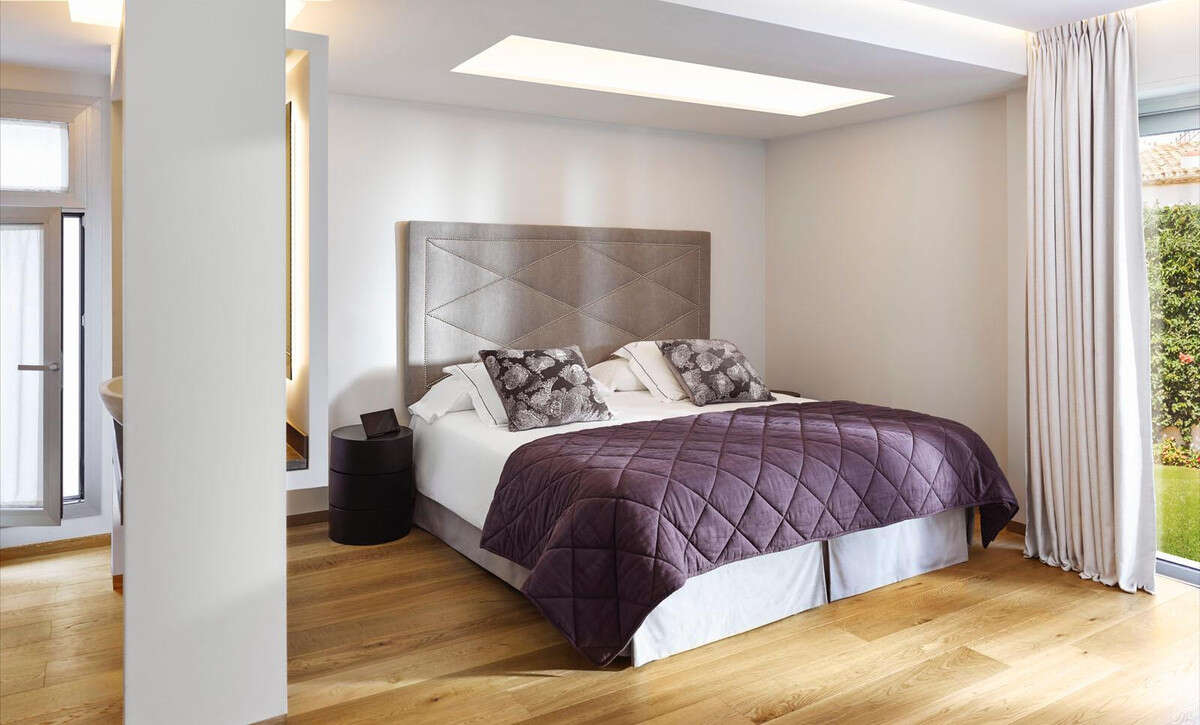 Contemporary 2nd line beach villa in Puente Romano, Golden Mile-Marbella. Built on 2 levels, this property comprises a good size open plan living/ dining room with integrated modern kitchen, fully equipped with top quality appliances and access to a south-facing terrace, garden, and pool. This level offers 2 bedroom suites, one of which with access to the garden. On the upper level there is the en-suite master bedroom with walk-in wardrobes and access to the terrace with breathtaking sea vies; as well as an additional en-suite double guest bedroom. The property is completed by a self contained en-suite bedroom on the ground level with separate access, ideal for staff or guests. Extra features include: under-floor heating throughout; A/C throughout; marble floors; good size swimming pool; alarm system, security blinds, wooden floors, etc.
