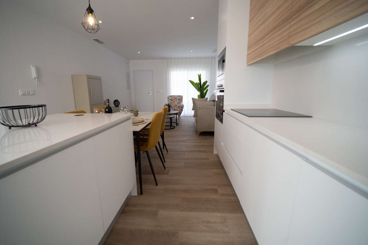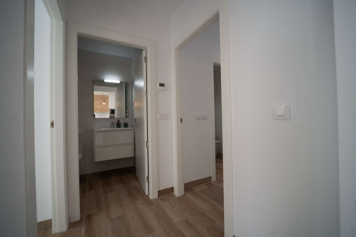 We offer both central and corner homes with different orientations. Each villa includes 2 bedrooms, 2 bathrooms, a fully fitted kitchen with Silestone countertop and appliances (extractor hood, ceramic hob, oven, fridge, dishwasher, washing machine, and microwave), a living-dining room, porch, terrace, and solarium. On-plot parking space.