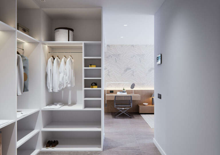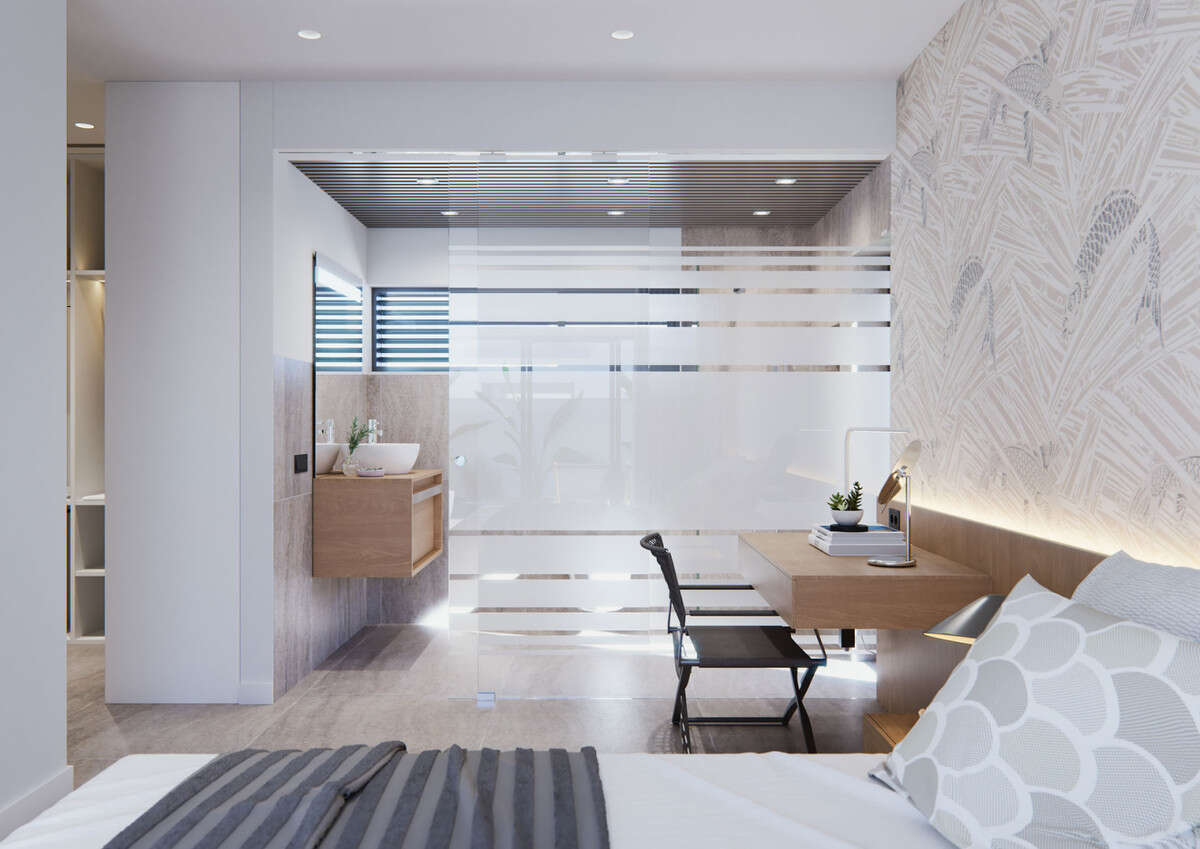 The modern and elegant kitchen in open concept with the dining room, surrounded by large windows that will provide throughout the day with a pleasant light and direct access to the pool and the private gardens completely finished, is fully customizable including high-end appliances embedded in design. Completely finished bathrooms with suspended appliances, countertop sinks and thermostat taps.
