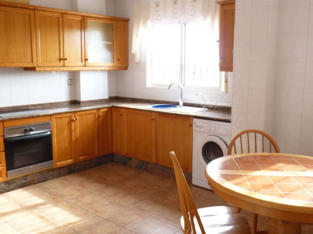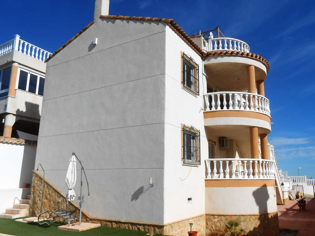 This is an exceptionally large detached villa with 4/5 Bedrooms and 3 bathrooms with a Private Pool in San Miguel De Salinas, set on a spacious plot the property also benefits from a 100M2 underbuild that can be converted . Entering the property, you are greeted by the very large living room, dining room area with air con. On this level there is 2 double bedrooms with built in wardrobes. At one end of the lounge there is also a very large sized kitchen area.and access to the large solarium which has stunning views to Torremendo lake, and the surrounding countryside. The property comes unfurnished. On the ground level there is an independant apartment consisting of a Master suite with ensuite bathroom. A lounge or Bedroom, A bathroom and a Bedroom or Kitchen. This is an ideal property to live in one half and rent the other half out!