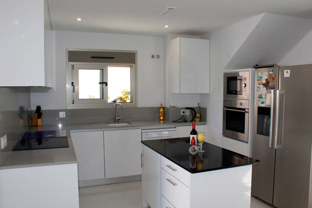The house is oriented south-east and benefits from plenty of natural daylight thanks to the open spaces and large windows. The villa has a beautiful spacious open plan living and dining area and comprises of a bright lounge/dining room with a fully-fitted kitchen with quality appliances, a bedroom with ensuite bathroom downstairs, 2 bedrooms with two ensuite bathrooms with shower and a terrace with nice open views upstairs.