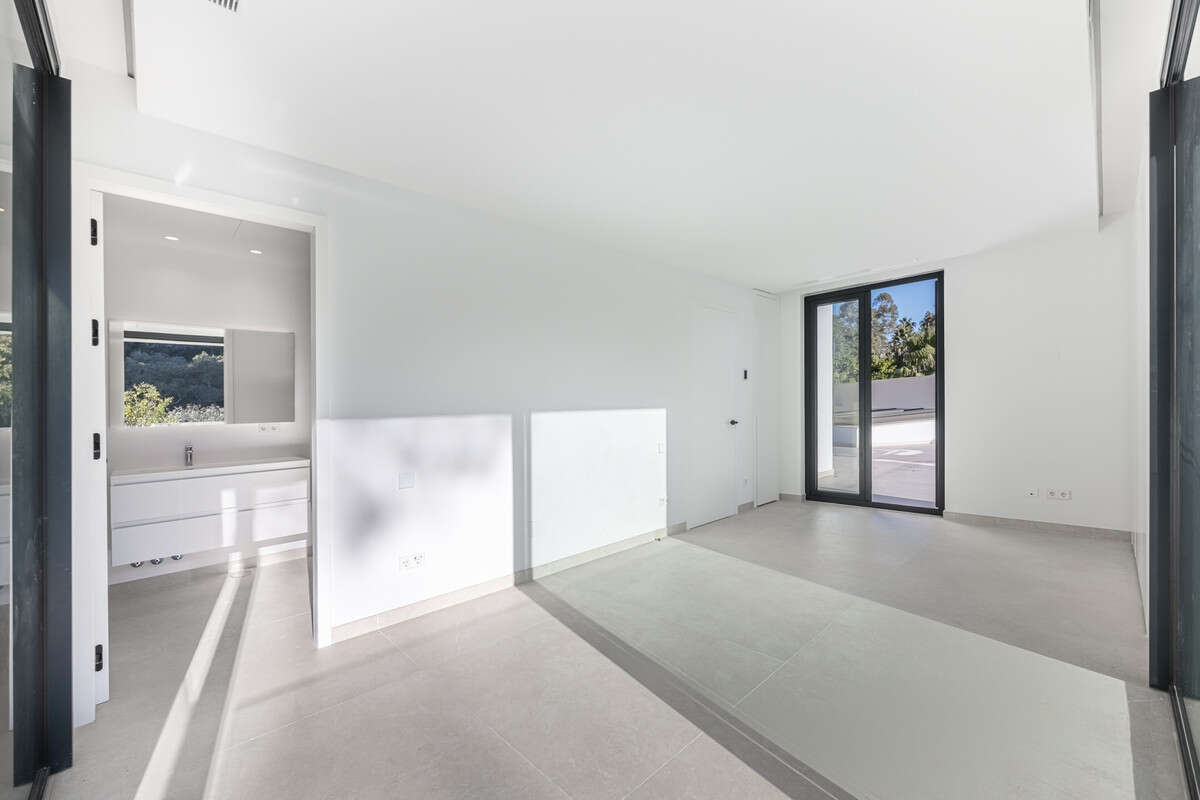 Tucked away on a quiet cul-de-sac in Sotogrande's tranquil F Zone, this striking new villa has been recently completed. Designed with modern living in mind, the home embraces its south-facing position, flooding the interior with natural light and opening up to lush garden views and the calming backdrop of native woodlands.