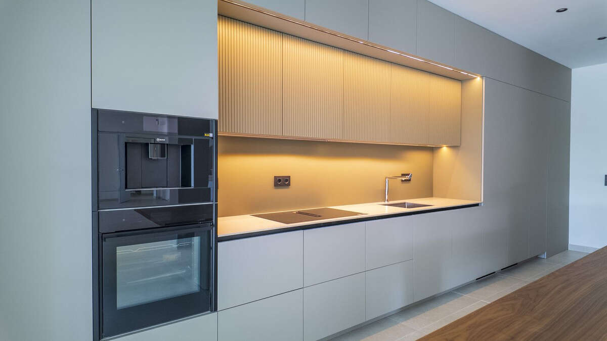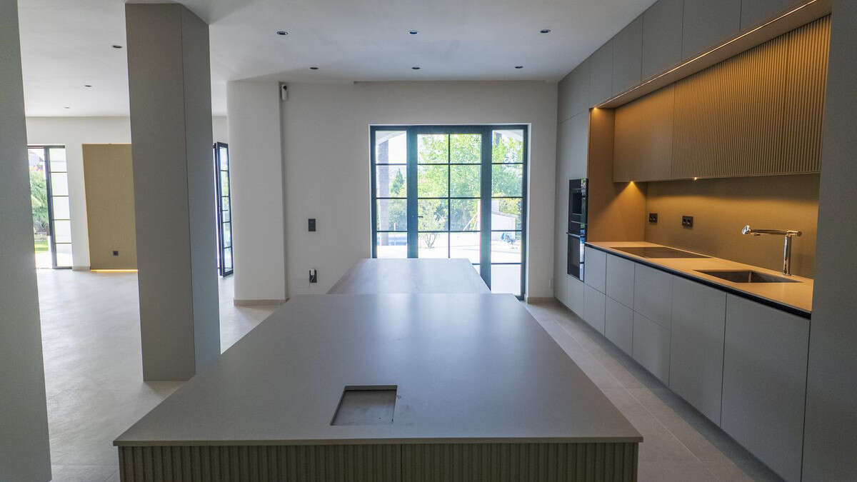 The modern kitchen is designed with the latest trends in mind and is equipped with a built-in two-door refrigerator, a wine cooler, and a cooktop with an integrated extractor, making it both aesthetically pleasing and highly functional.