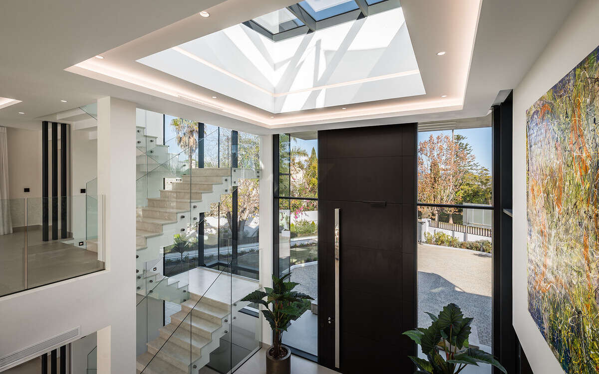From the moment you arrive, the property impresses with its striking contemporary design, characterized by clean lines, natural materials, and expansive floor-to-ceiling glass that invites natural light and connects the interiors effortlessly to the surrounding gardens. A grand, spacious entrance opens to a stunning double-height main living area, rising six meters high, which immediately sets a tone of openness and modern elegance.