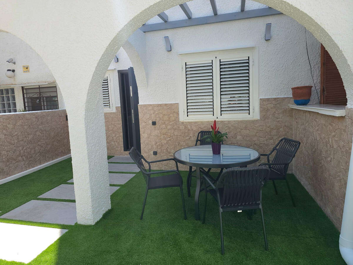 We present this stunning fully renovated bungalow located in the coveted area of Playa del Cura, Torrevieja. With a built area of 94 m² and a usable area of 65 m², this property features a modern design that includes a complete overhaul of the electrical and plumbing installations. The facade has been renovated, and new windows and doors have been installed for added convenience. Enjoy your cozy private patio, perfect for relaxing outdoors.The location is unbeatable; just 800 meters away you will find the beach as well as all essential services: supermarkets, pharmacies, schools, and varied infrastructure that will facilitate your day-to-day life. Additionally, the residential complex offers three community pools surrounded by pleasant walking paths ideal for strolling or exercising.This safe and family-friendly environment promotes harmonious coexistence among international neighbors, which adds cultural value to the community. This property not only represents an excellent option as a permanent residence but also as a vacation investment given its proximity to the sea.