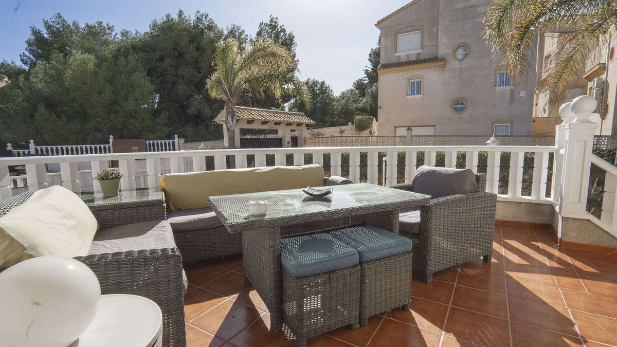 Four bedroom property with private pool overlooking the 5th tee of Villamartin Golf Course. The property has four bedrooms that sleeps 8, a large living area with open plan kitchen and stairs leading up to a private roof solarium. On the floor level there is a double bedroom with en suite bathroom and twin bedroom with a further family bathroom with a bath . Downstairs there is a further 2 twin bedrooms and a further bathroom with a shower enclosure. The property also has a large games room with bar area, Satellite TV & Wifi. There is a large outside area with BBQ and garden furniture inc sunbeds. Only 20 minute drive to Murcia Airport and 40 minutes from Alicante Airport This property is ideal for large groups or families that want to holiday together but want their own space. It is close to several Golf courses and all amenities. There is ample outside space from the decking area near the pool to the spacious roof solarium with amazing views over the Villamartin golf course. There is a games room with darts and table football table, TV and a bar. The Villa has a Tourist Licence and a proven history of rental income