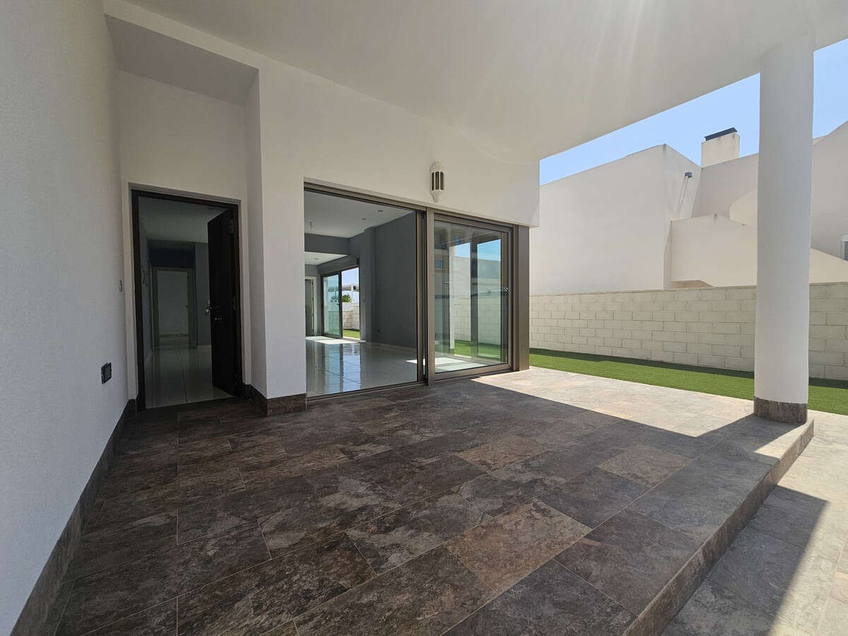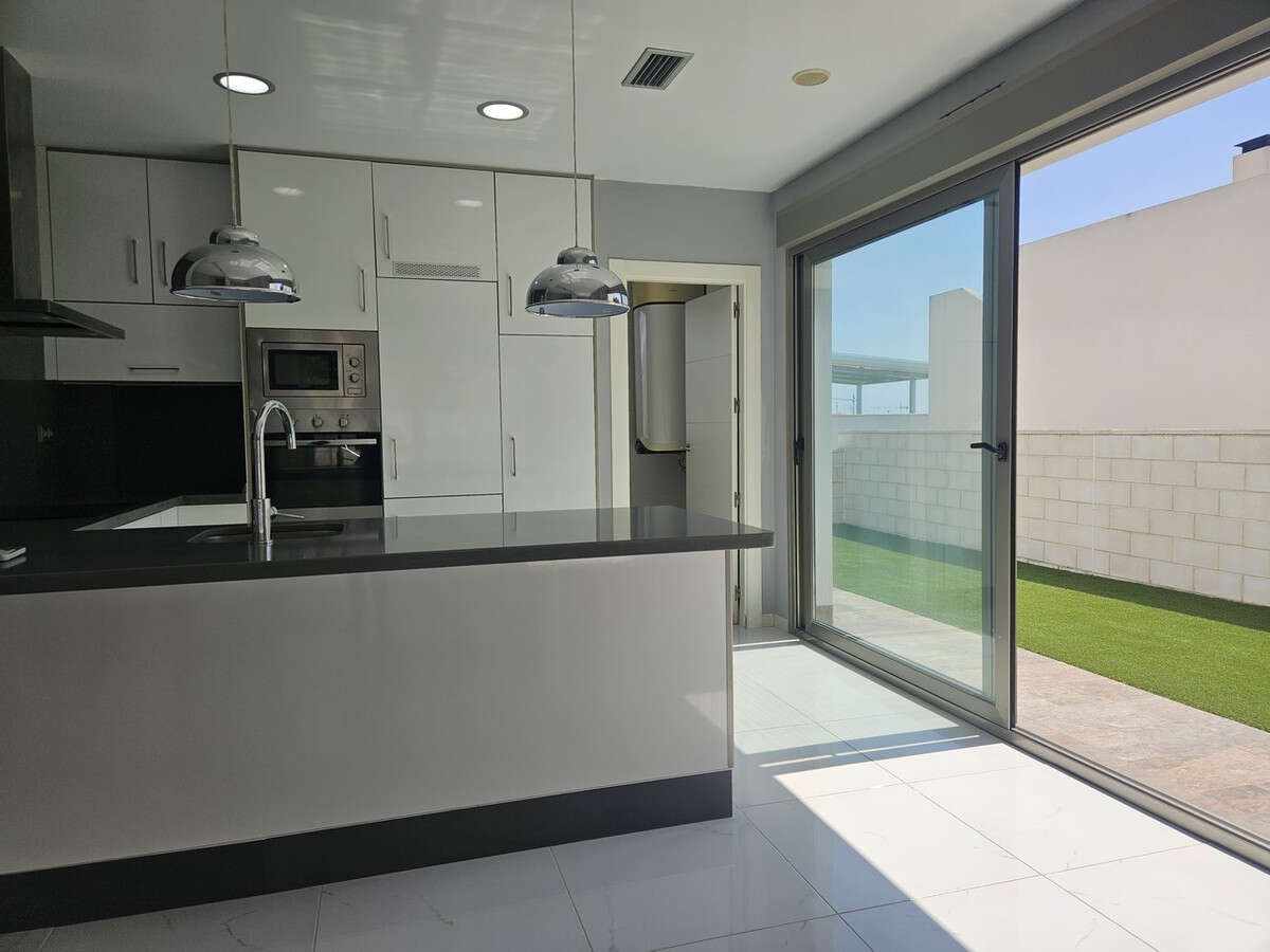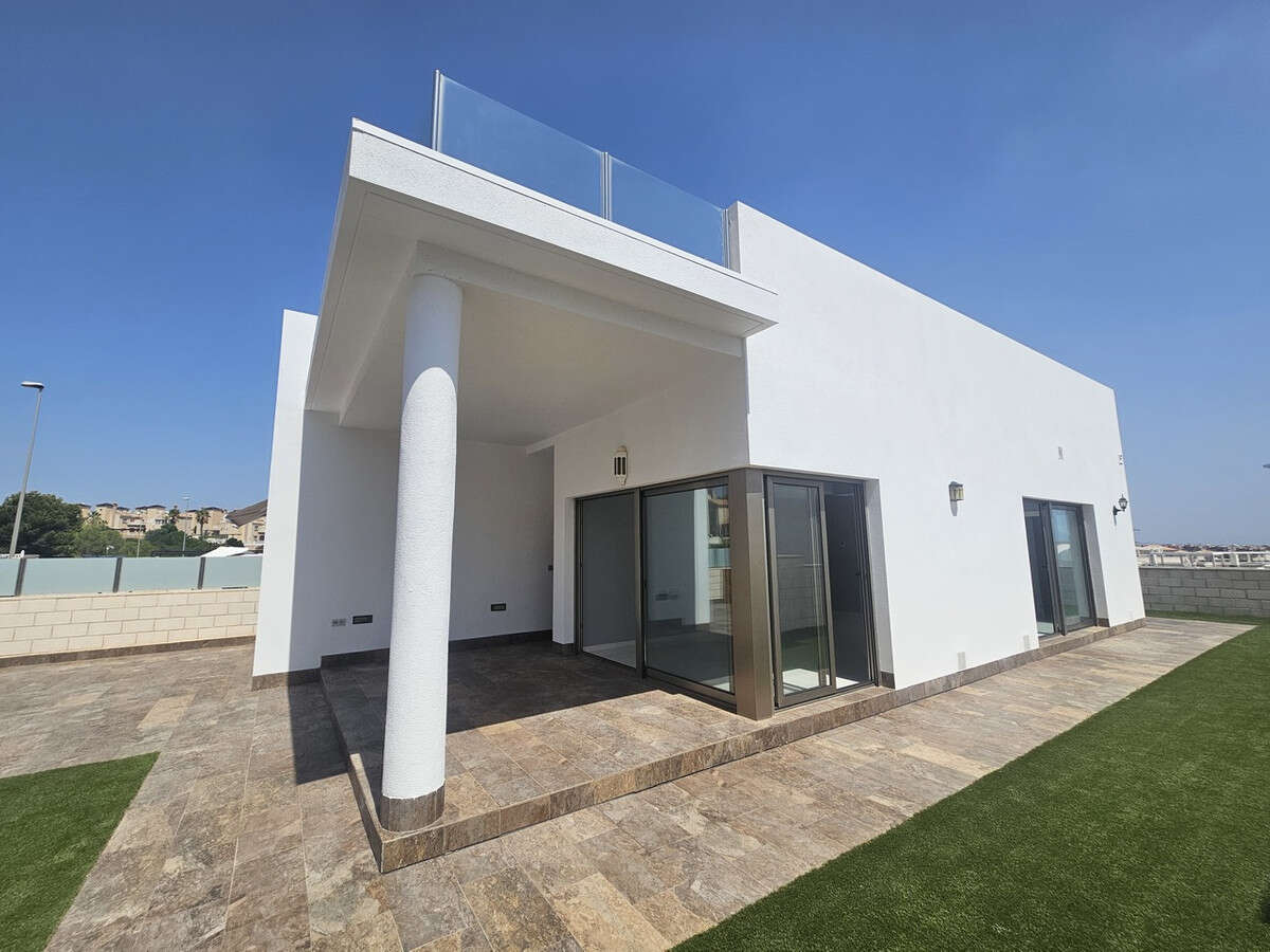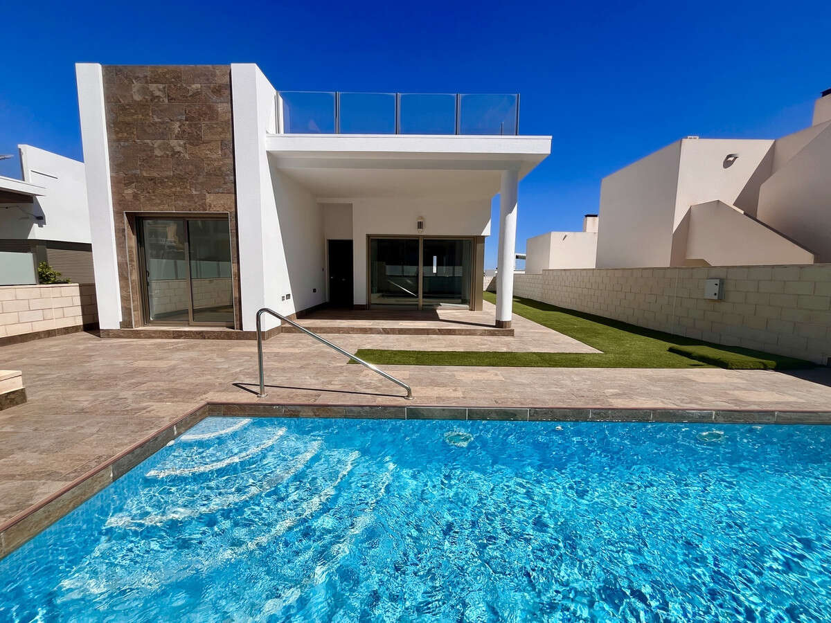 This villa sits on a 330m South facing, sunny plot with private swimming pool, off road parking and wraparound sun terraces which have been finished with artificial grass for comfort. Inside is a huge living area with impressive floor to ceiling windows and patio doors providing lots of natural light and lead directly outside to a relaxing covered terrace area overlooking the swimming pool. There is an uber modern fully equipped kitchen with an independent utility, laundry and storage room. The villa has a huge master bedroom with en-suite bathroom, two double guest bedrooms and a family bathroom complete with bathtub. This villa also boasts a superb rooftop solarium with very pretty views towards the neighbourhood and out towards Torrevieja pink lakes.