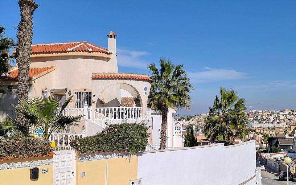 This east-facing Alhambra-style detached villa in Ciudad Quesada offers generous space, beautiful views, and superb outdoor living. Set on a large 485 m² plot, the property features a private kidney-shaped swimming pool, garage, and wide terraces that wrap around the villa, providing multiple areas to relax while enjoying views of the surrounding landscape and distant mountains.Inside, a spacious terrace leads into a bright lounge and dining area that forms the welcoming heart of the home. Infrared heating panels and air conditioning ensure year-round comfort, while the newly installed modern kitchen combines style and practicality.The main bedroom, accessed from the lounge, includes a built-in wardrobe, ceiling fan, and infrared heating. Two additional double guest bedrooms are located to the rear of the property alongside the family bathroom.On the lower level, a separate guest area offers its own kitchen, shower room, and sleeping space—ideal for visitors or extended family.Outside, the pool terrace provides ample space for sunbathing and entertaining, with additional terraces offering both sunny and shaded seating throughout the day. The rear terrace is particularly enjoyable in the afternoon sun with open views.Twelve solar panels above the garage enhance energy efficiency. The villa is sold unfurnished, giving you the opportunity to personalise it to your taste.