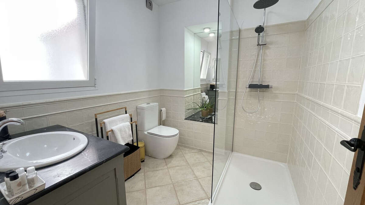 The first floor houses the second apartment, which exudes a sense of spaciousness and comfort. It boasts two double bedrooms, a stylish living room, and a well-appointed shower room. The separate kitchen, with its sleek finishes, provides ample space for culinary pursuits and leads out to a large terrace, offering a serene retreat for relaxation and outdoor gatherings.