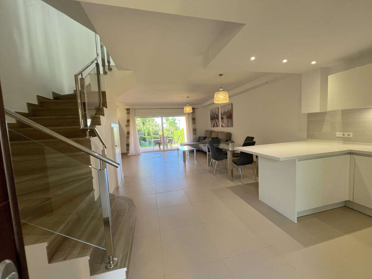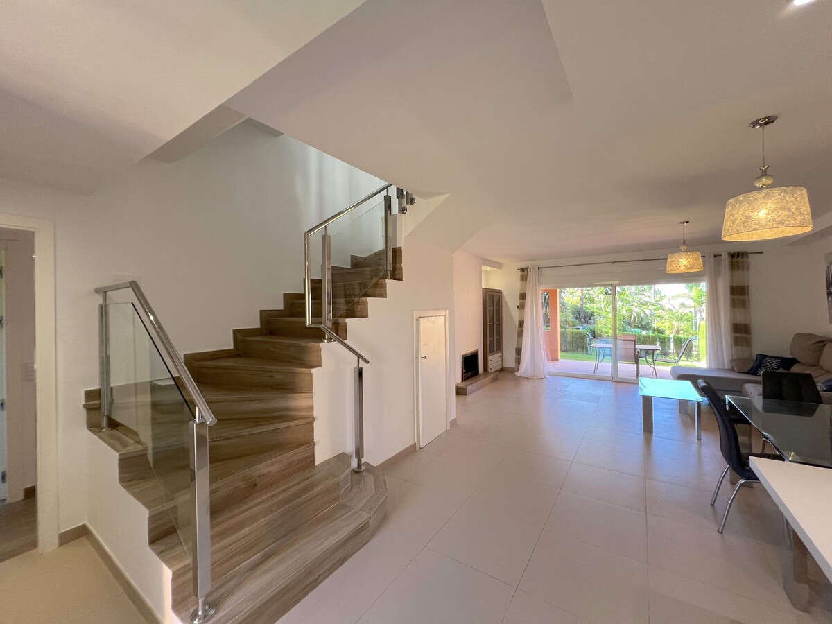 Its south-west facing living room has a large sliding door that opens onto a porch overlooking a private garden that leads to a large communal garden with swimming pool and an extensive garden area. The open plan kitchen leads through to the dining room. The upper floor is the sleeping area. The hallway gives access to the bedrooms and its bathrooms, one of them en suite. The solarium is a perfect space designed to enjoy the sun. It is ideal for resting, relaxing and sharing it with friends or family. From the top of the house, you can see the communal tropical garden, the swimming pool, the mountains and the sea.