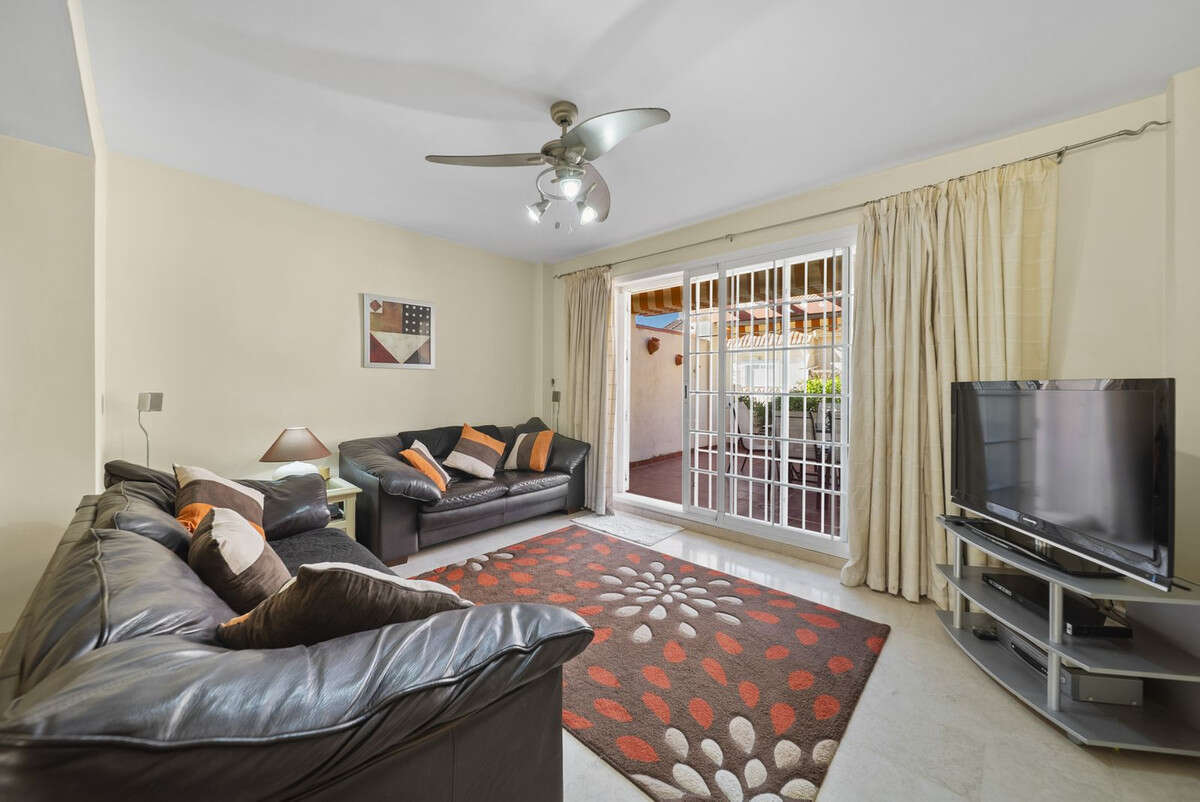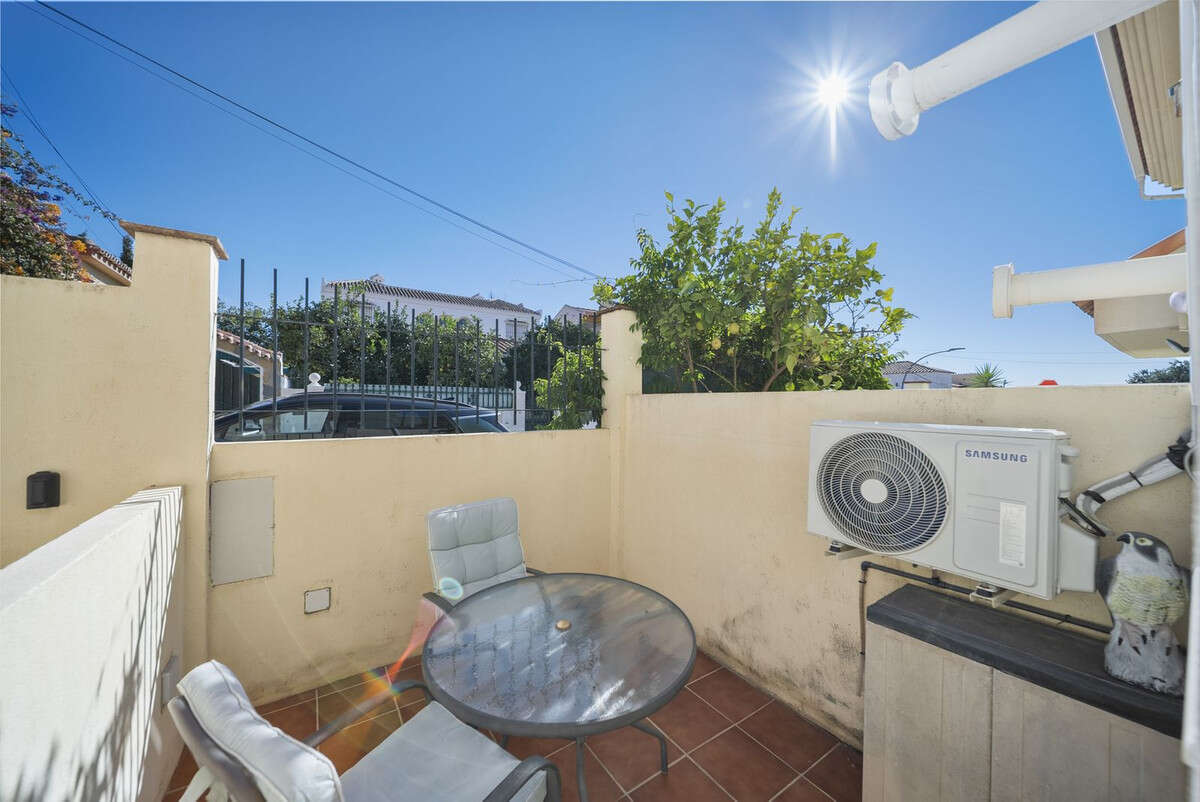 Enter via a gated entrance into a bright hallway leading to a spacious living-dining area that opens onto a large terrace with toldos (awnings) — perfect for alfresco dining or sunbathing. The terrace allows direct access to the communal gardens and pool.