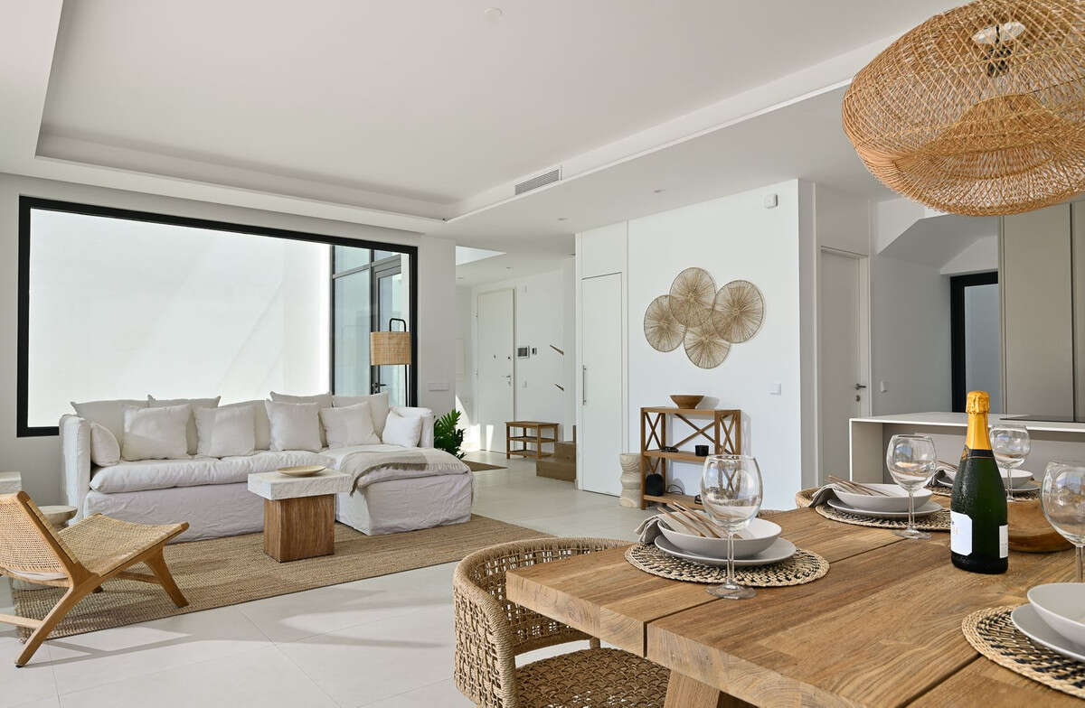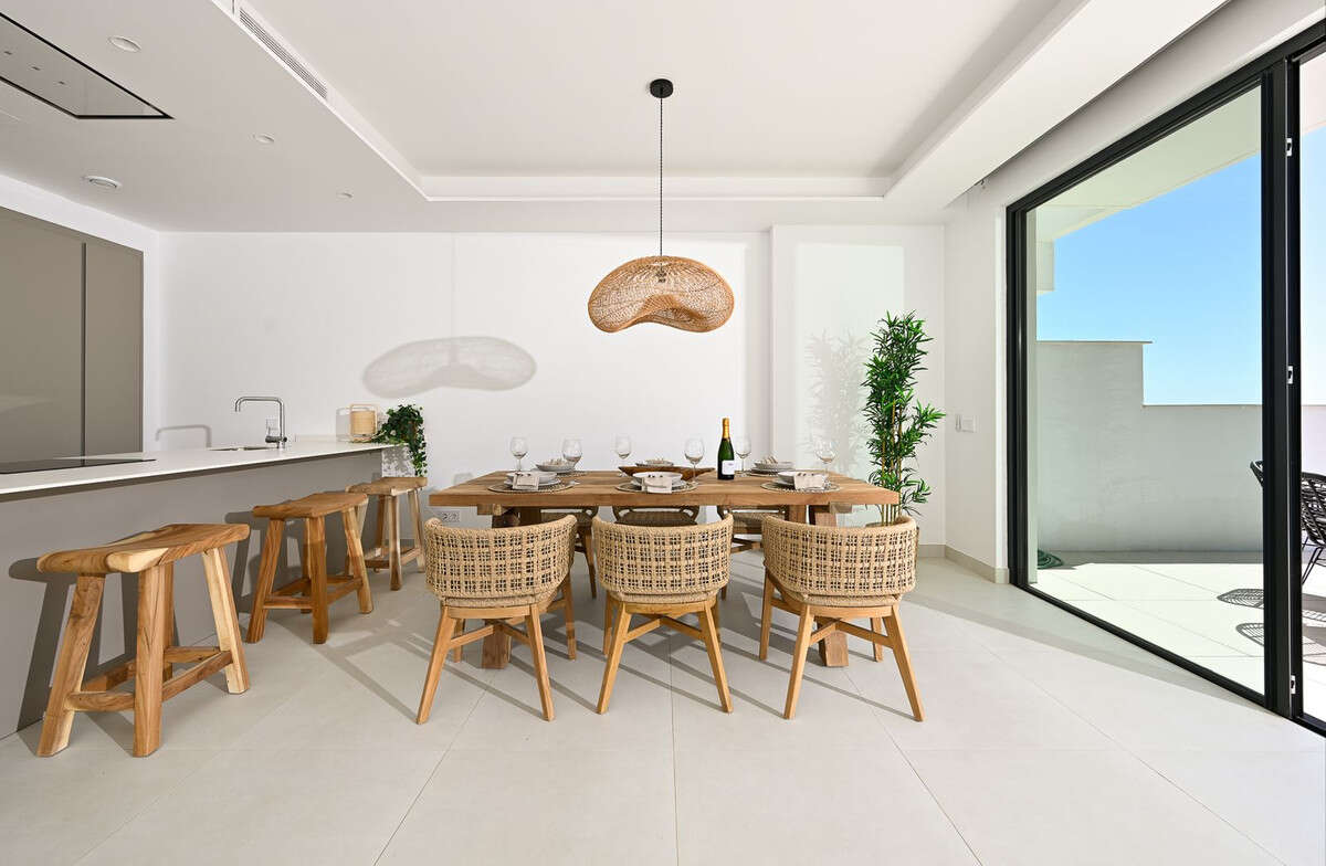 The heart of the home is a state-of-the-art, open-plan kitchen, dining, and living area, where modern aesthetics meet comfort and functionality. The space flows effortlessly onto a sunny south-facing terrace, perfect for alfresco dining and entertaining under the stars.