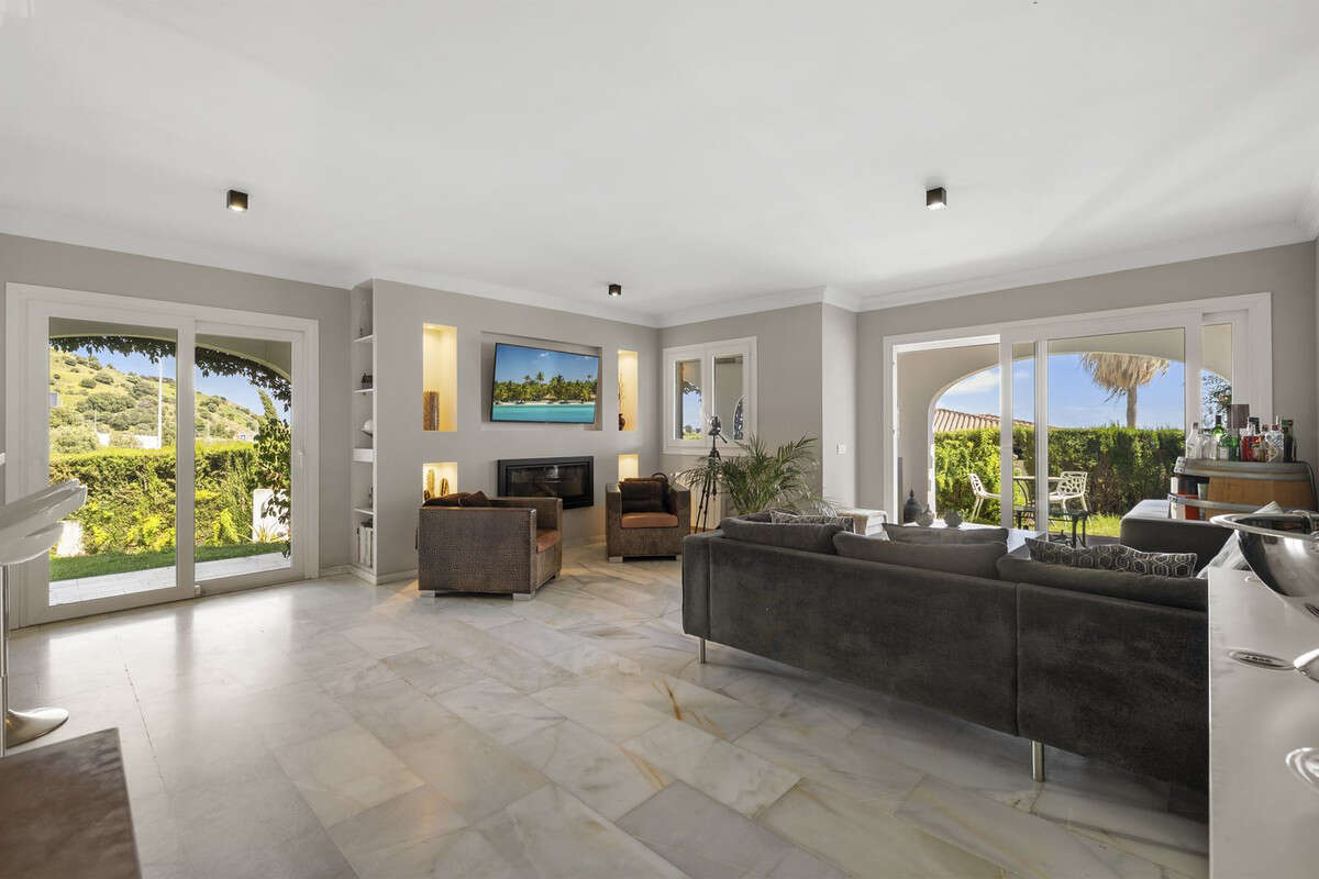 The entrance offers generous storage, a guest toilet, and a staircase to the upper level. The spacious, light-filled living room features a cozy fireplace and opens onto covered terraces and a lush garden. A sleek, modern kitchen with Siemens built-in appliances is perfect for cooking and entertaining. From the south-facing garden and covered terrace with built-in BBQ you can enjoy spectacular sea views. Your private garden - maintained by the community, so low maintenance for you - leads directly to the communal gardens and a beautiful communal pool just 30 meters away.