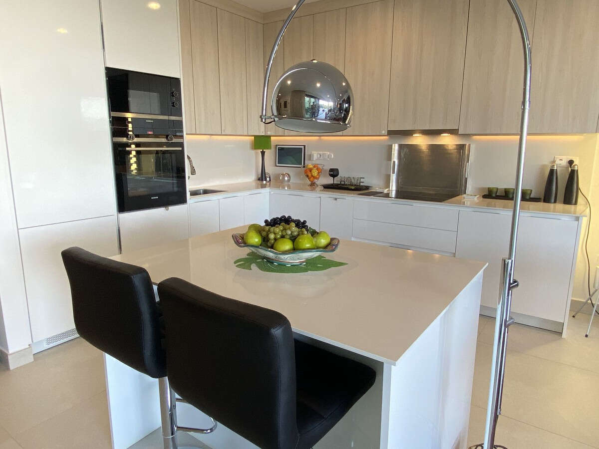 The master suite includes a walk-in closet and private terrace, complemented by two additional bedrooms ideal for guests or family. Marble floors, premium carpentry, and full climate control ensure comfort and elegance throughout.