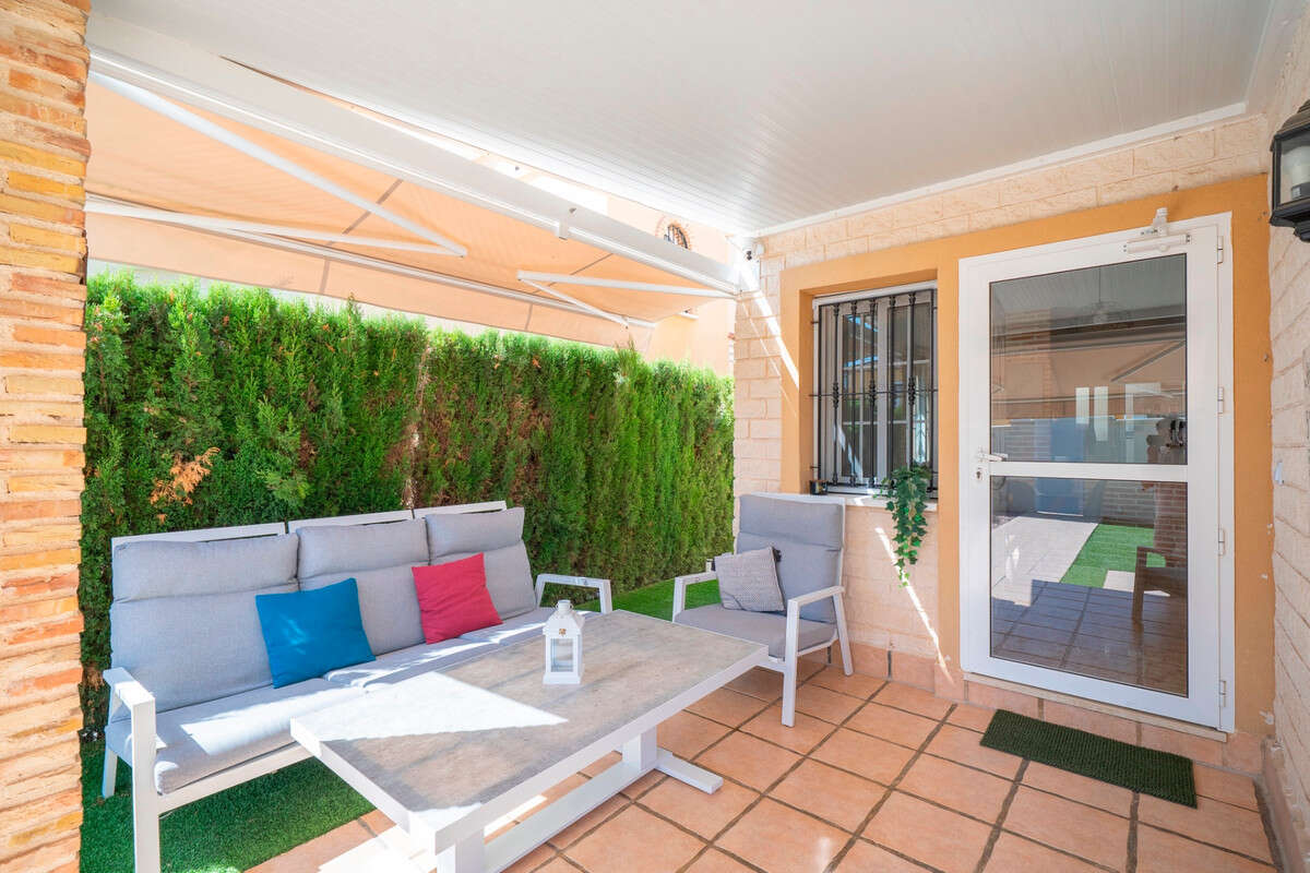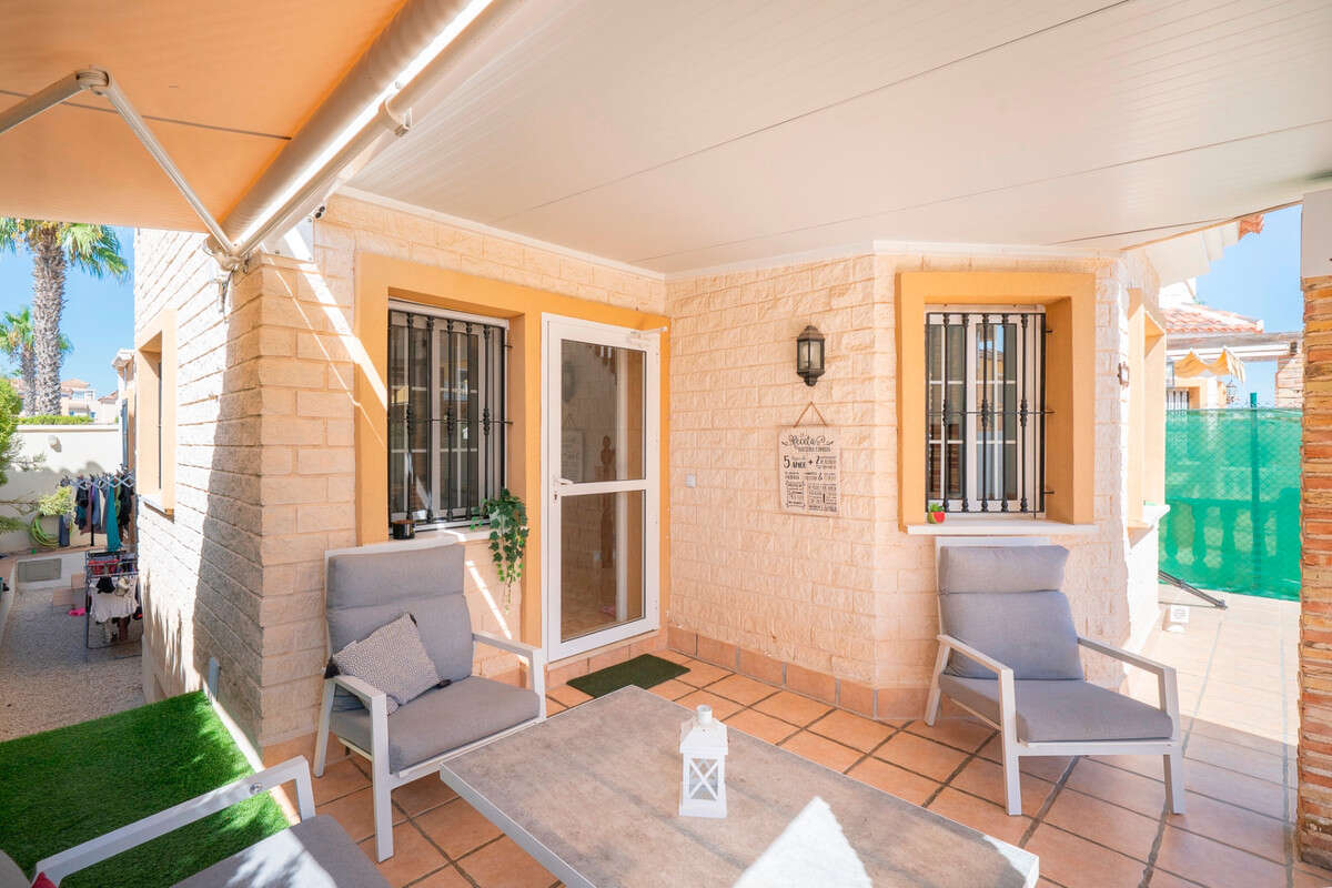 The exterior surrounds the entire house, and at the front, there is a cozy wooden pergola that invites you to enjoy meals and family gatherings sheltered from the sun. The property also has a back door that connects directly to the road where the entrance to the community pool is located, offering convenience and quick access to the common area.