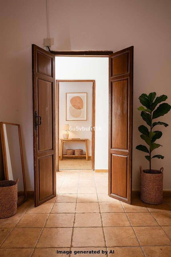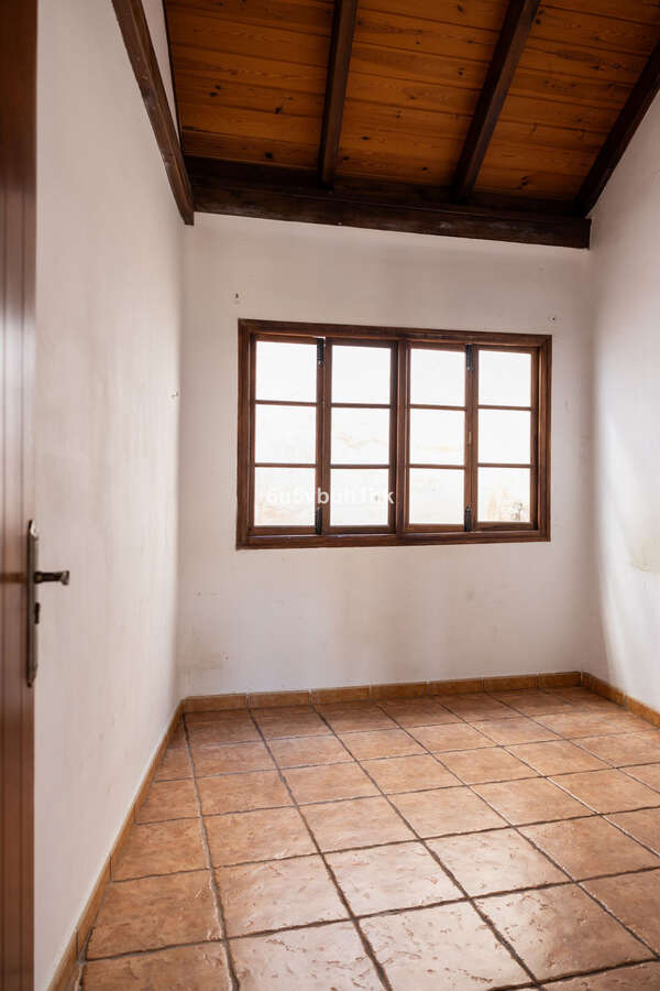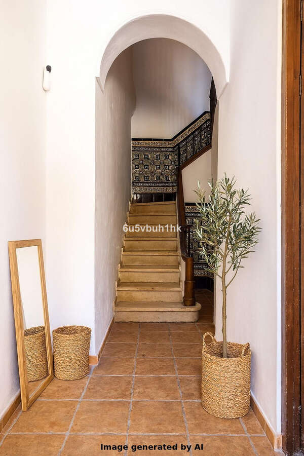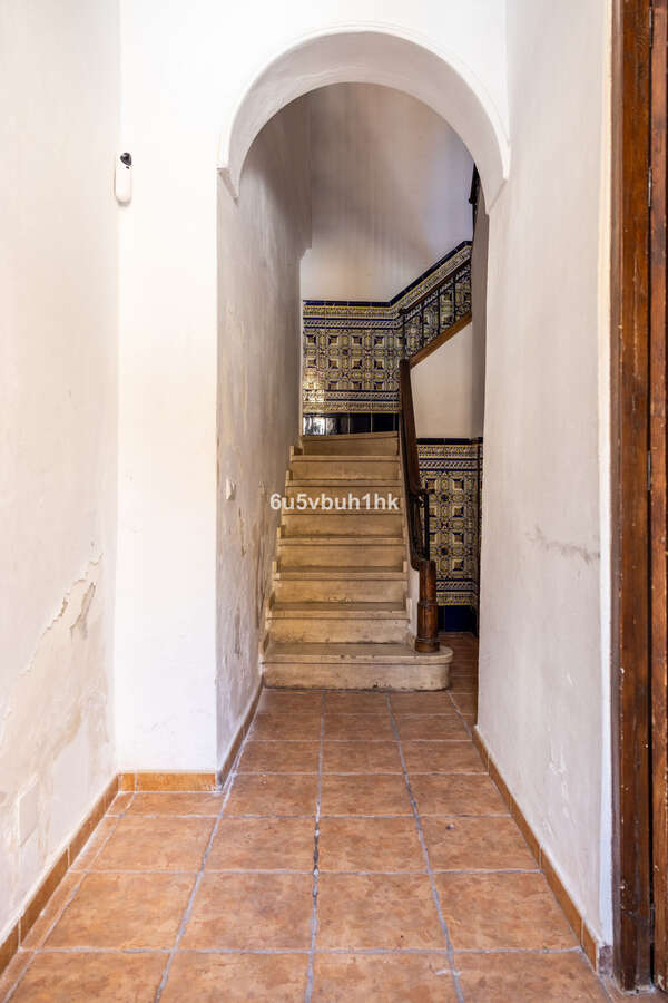 The current layout of the house includes an entrance hall on the ground floor, with an old garage on one side, converted into a room or lounge, and a bedroom on the other. Moving to the rear of the property, you'll find a kitchen and a patio with a laundry area. Additionally, there's a convenient bathroom on this floor. A beautiful staircase, adorned with Andalusian-style tiles and centrally located, leads to a well-lit upper floor with sloping wooden ceilings and curved wooden windows throughout. Here, you'll discover two bedrooms and a spacious bathroom.