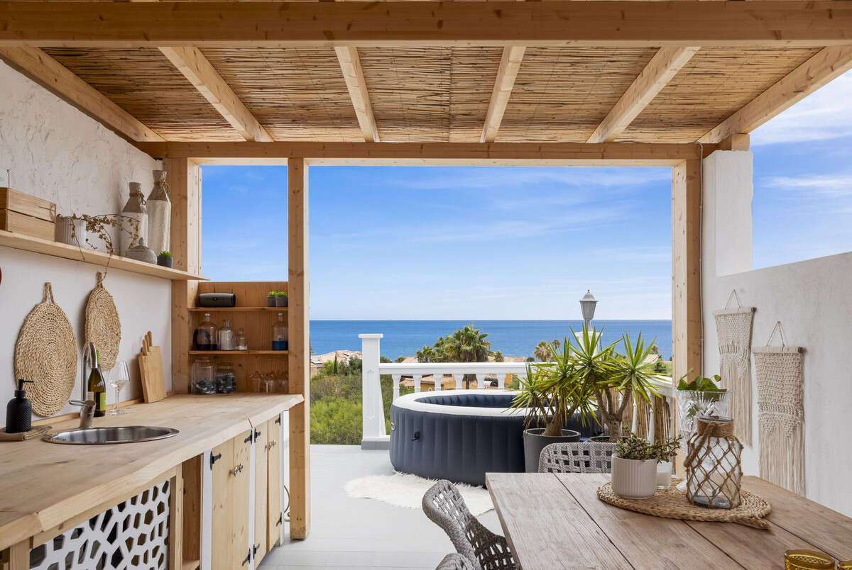 If you go up from the terrace via an outdoor staircase, there is a sensational outdoor kitchen created, a very cozy space where you can privately enjoy the beautiful sea view with friends. This charming outdoor kitchen is equipped with all conveniences; built-in appliances such as a dishwasher and refrigerator, a nice dining table for 6 people, a fully equipped bar cabinet with plates and glasses, in short, everything you need for a lovely summer evening.