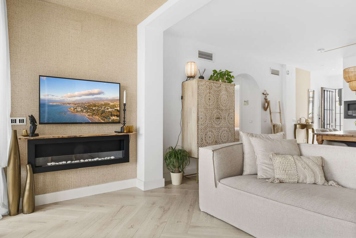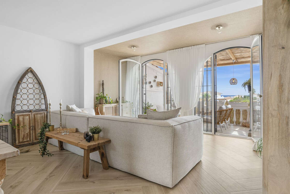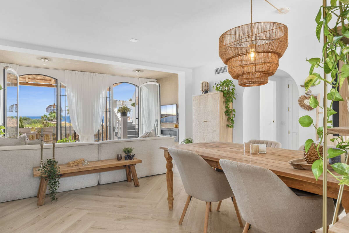 It has a very cozy, spacious living room with an open kitchen that is equipped with all the necessary appliances. From the living room, you can directly access the terrace. Both the kitchen, living room, and terrace offer stunning sea views.