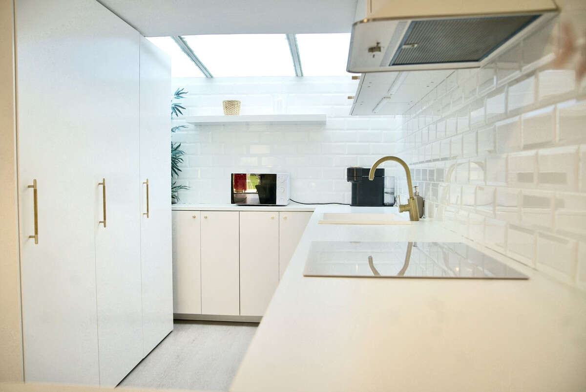 Upstairs, the home features three bedrooms, including a primary suite with access to two private terraces, and two bathrooms, all flooded with natural light.
