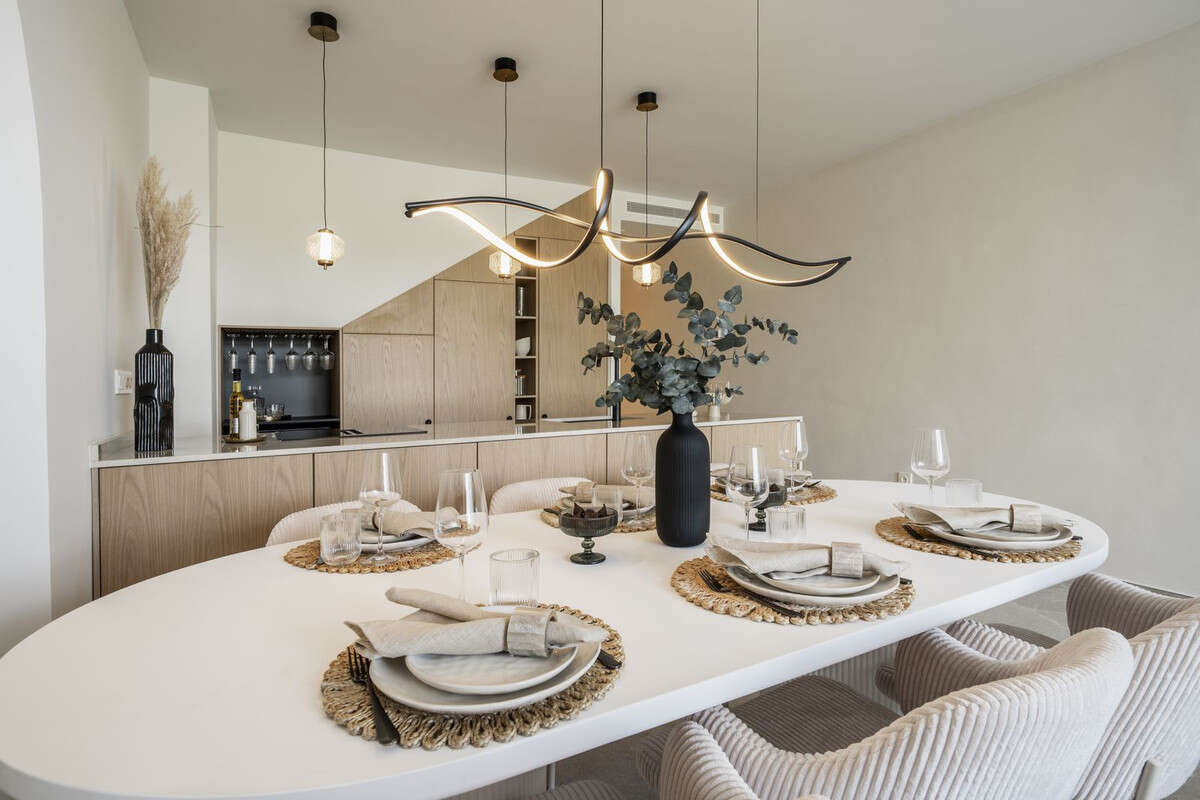 The community features mature gardens with tall palm trees and a peaceful shared pool, creating a calm and private atmosphere. Recently renovated from top to bottom, Casa Preciosa combines high-quality materials with a smart, stylish layout across two bright floors. The ground floor offers an open-plan living space with a sleek kitchen and a welcoming lounge that opens onto a sunny terrace—an ideal spot for outdoor dining with views of the garden and pool, and direct access to the communal green areas.