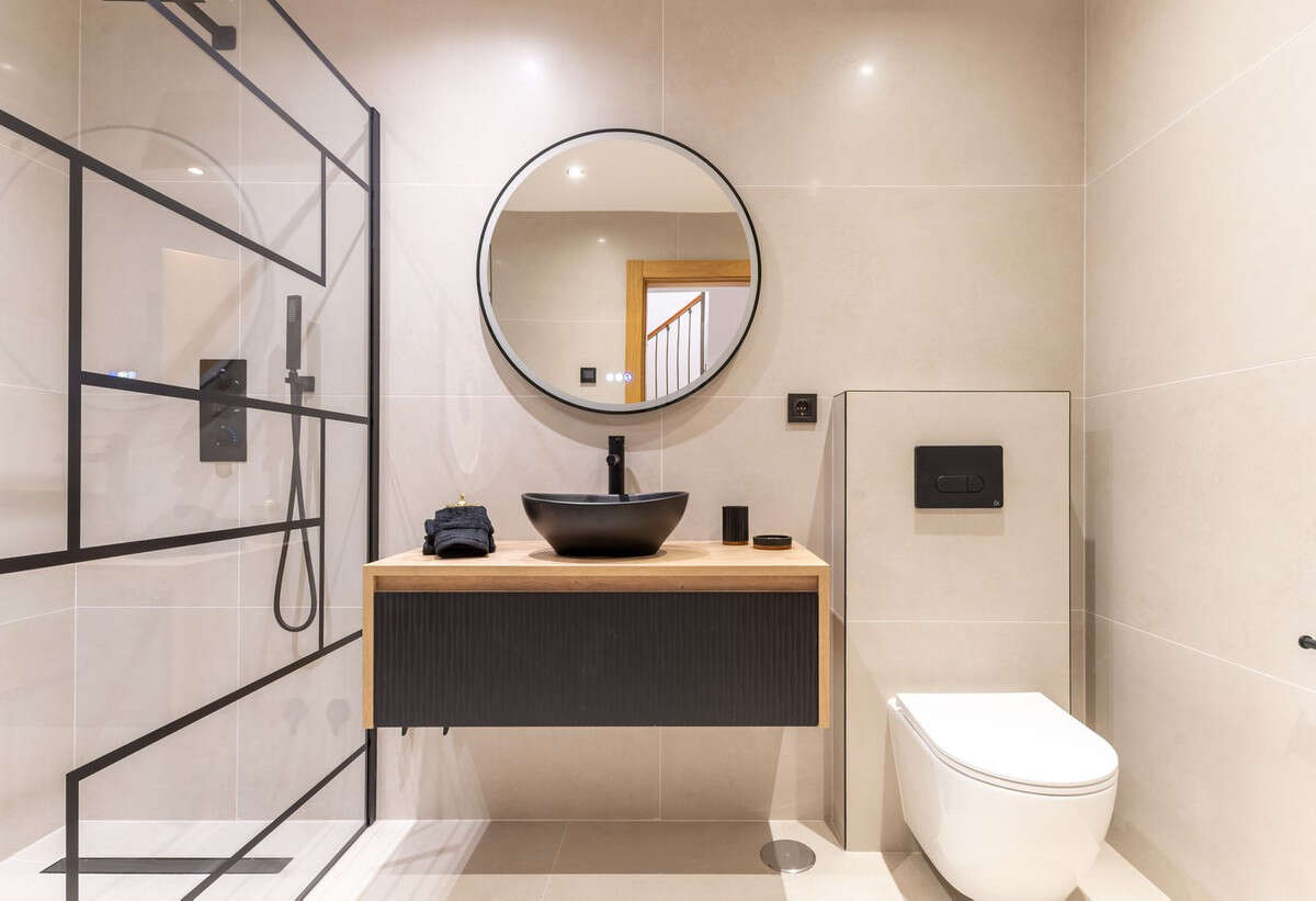 The open-plan living and dining area flows into a sleek, fully fitted kitchen with integrated appliances and a wine cooler. A contemporary fireplace creates a warm focal point, making the space ideal for both everyday living and entertaining. Each bedroom is equipped with fitted wardrobes and en-suite bathrooms. The master suite enjoys its own terrace and generous bathroom, while the top-floor suite features a private terrace and storage – perfect for guests, a home office, or a retreat.