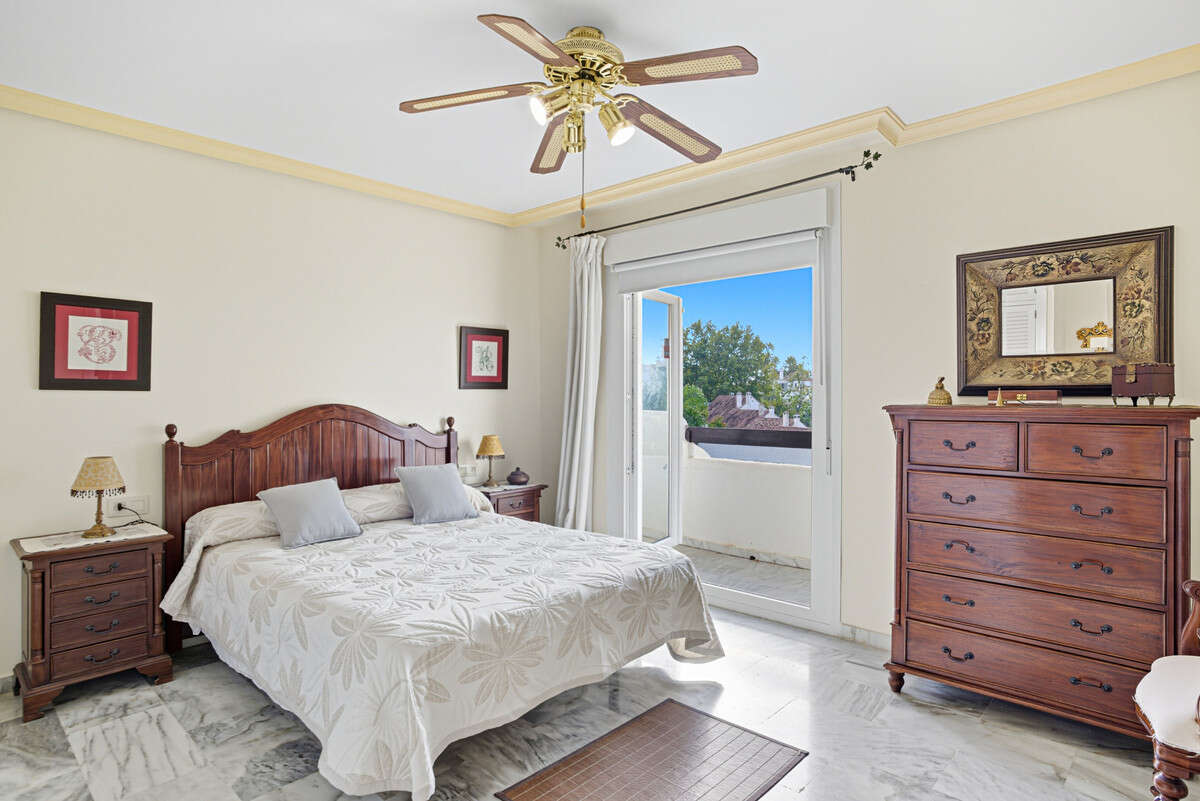 This lovely three-bedroom, south-facing townhouse is set in the sought-after gated community of El Capricho on Marbella's Golden Mile, offering spacious tropical gardens and two communal swimming pools. Ideally located within walking distance to the beach, bars, and restaurants, and just a short drive from Marbella Center and Puerto Banús, the property combines convenience with charm. The ground floor features a bright living and dining area with a fireplace and access to a generous terrace perfect for outdoor dining, a newly renovated separate kitchen, and a guest toilet. Stairs lead down to a large basement currently used as a bedroom and art studio with its own bathroom. Upstairs, the master suite is accompanied by two guest bedrooms and a family bathroom. Additional highlights include fitted wardrobes, marble floors, and private parking for one car.