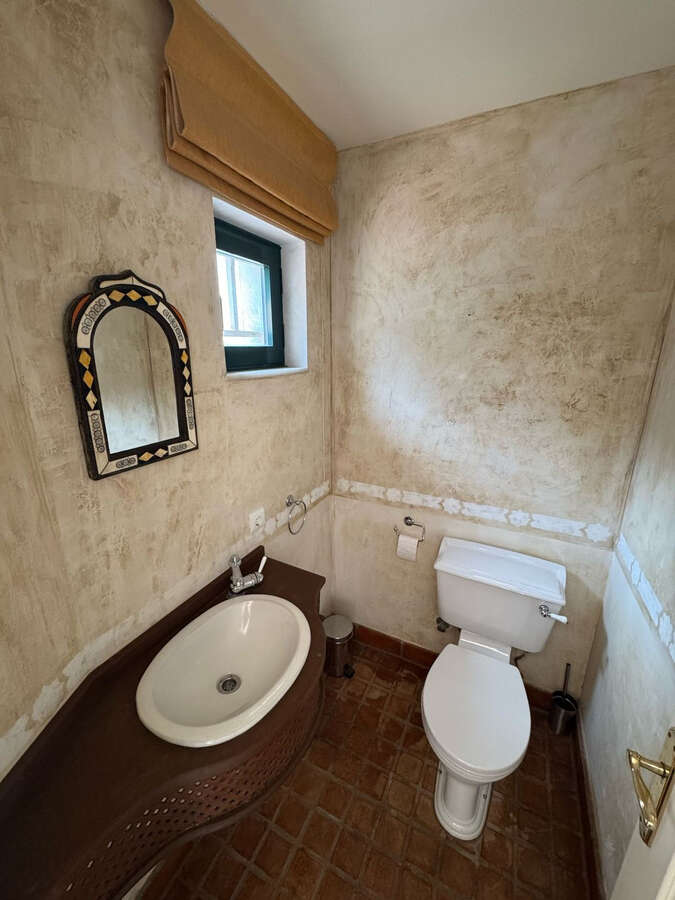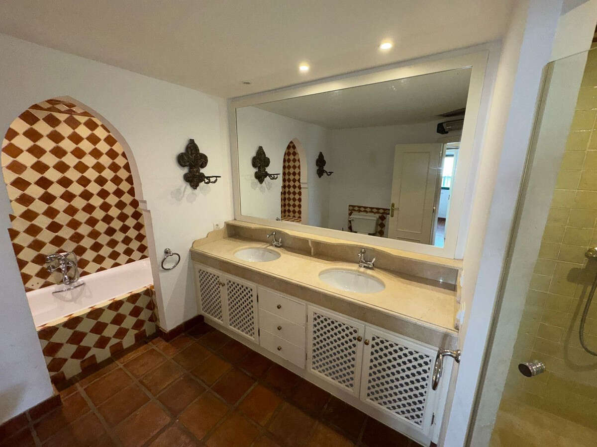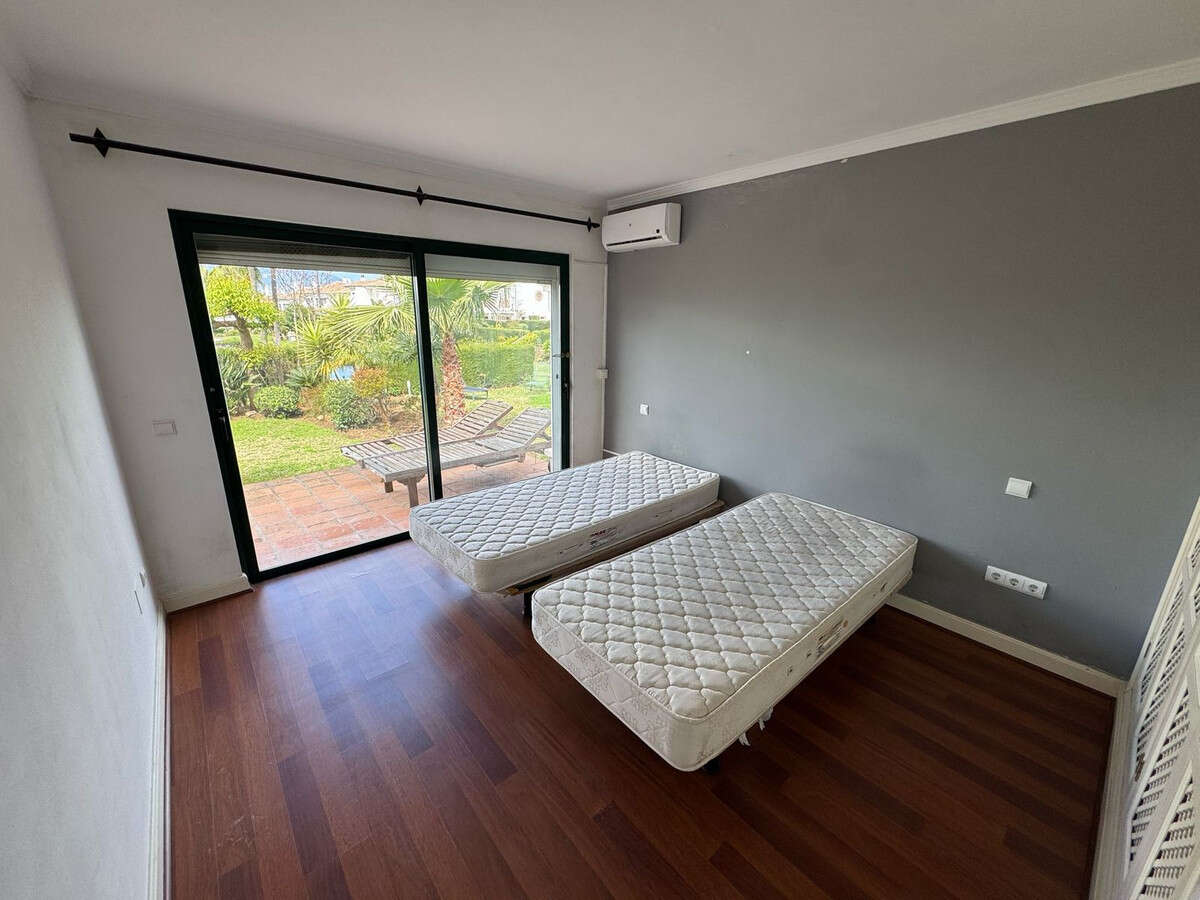 The lower level houses the master suite with direct access to a private garden, along with two guest bedrooms and a private double garage. Additional features include a fully fitted kitchen, guest toilet, hot and cold air conditioning, electric shutters, and fitted wardrobes. This property presents an excellent renovation opportunity in a peaceful yet well-connected residential community.