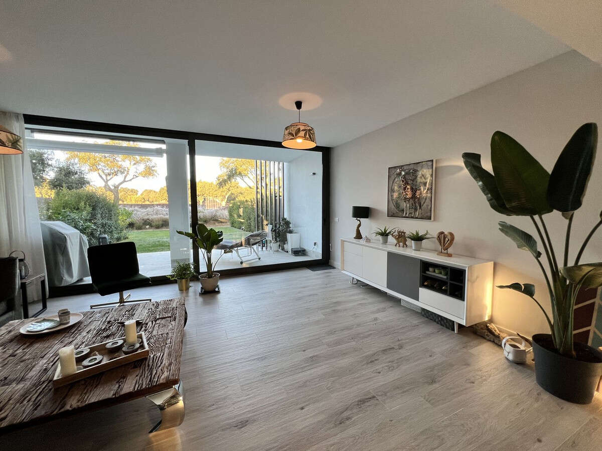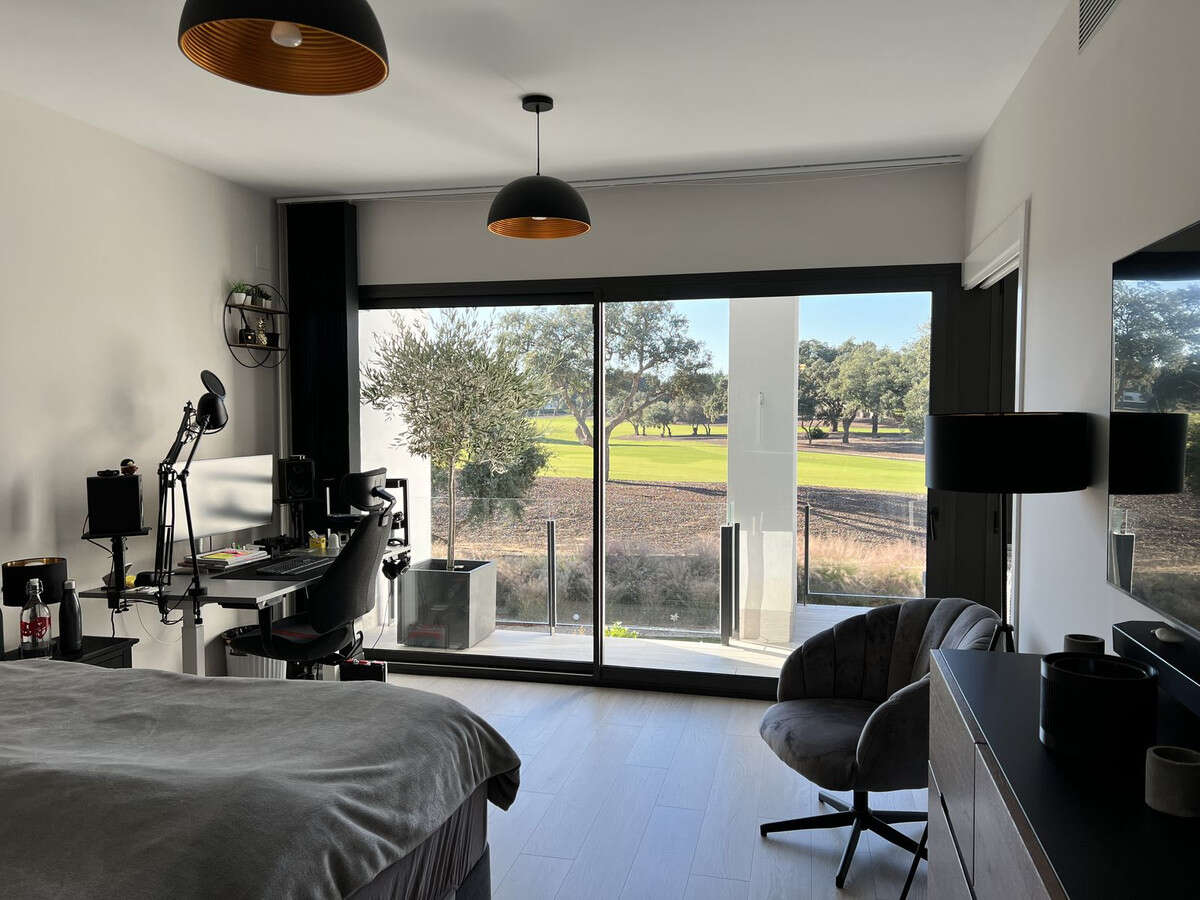 The ground floor boasts a bright and airy living room that opens up to a large west-facing terrace and private garden, perfect for outdoor gatherings, with stunning views of the golf course. The sleek, modern kitchen is fully equipped with high-end appliances. Also on this level, you'll find a convenient guest WC and a useful storage room. Upstairs, the master bedroom comes with an en-suite bathroom and a private glazed balcony overlooking the golf course. Two additional well-sized bedrooms share a bathroom with a bathtub, and have access to a balcony with views of the community pool.