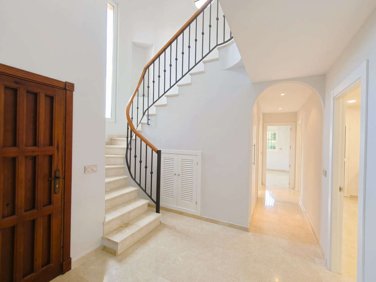 On the entrance level, there is a comfortable guest bedroom and a full bathroom. Upstairs, you'll find two generous en-suite bedrooms, each with its own private terrace. The second bedroom's terrace leads up to a rooftop solarium with stunning panoramic views of the surroundings.