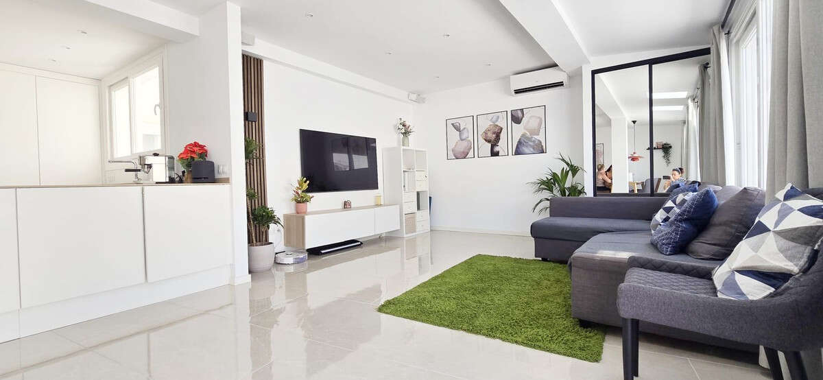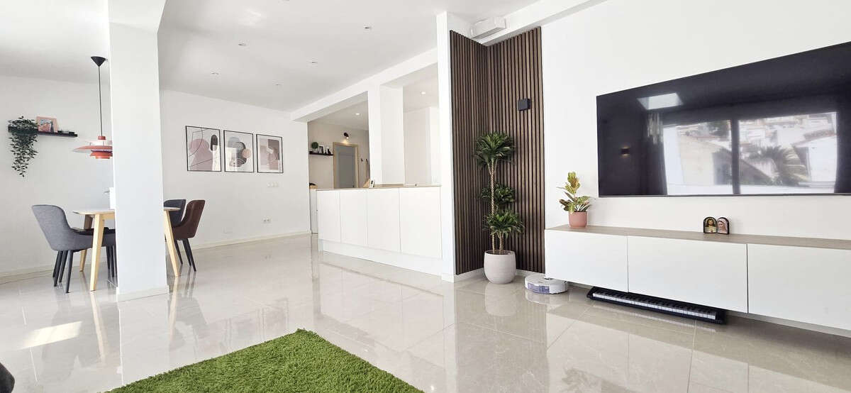Inside, you will find three spacious bedrooms, two modern bathrooms, a bright living room with large windows, and an elegant open-plan Nordic-style kitchen that brings both warmth and space. The entire property has been renovated and modernised with high-quality materials, including porcelain stoneware flooring.