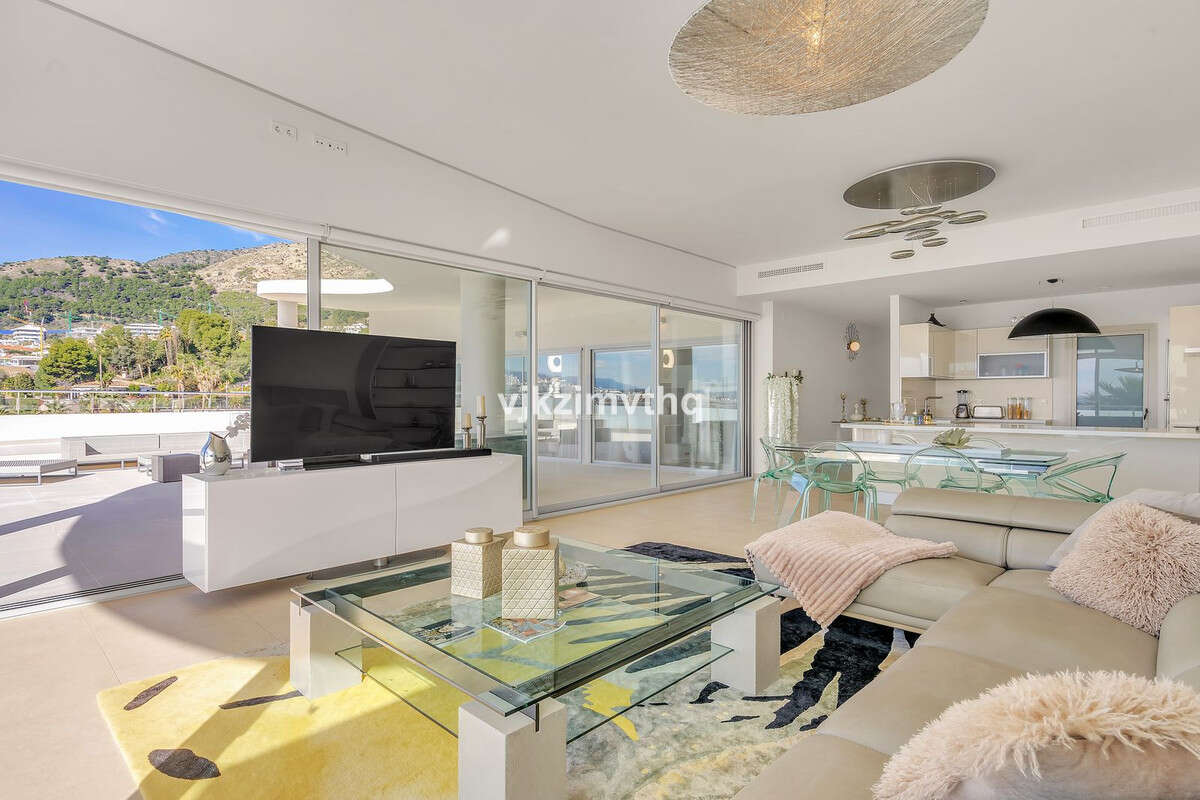 The bright open-plan living space connects directly to spacious terraces through large sliding doors, creating a seamless indoor-outdoor flow. From here, you enjoy unobstructed views towards the Mediterranean and the Fuengirola coastline.