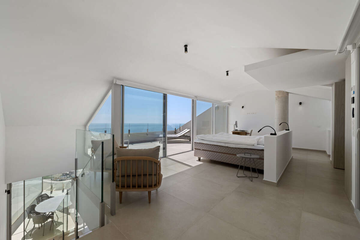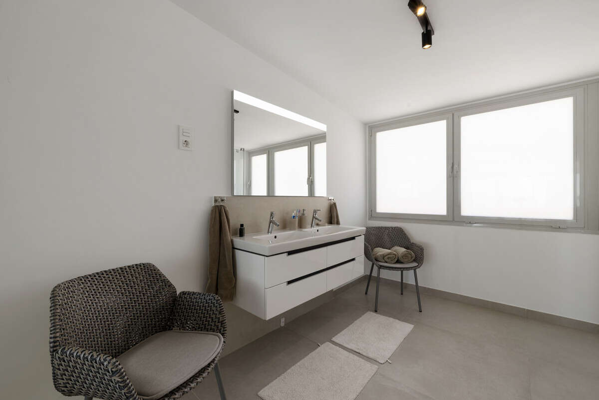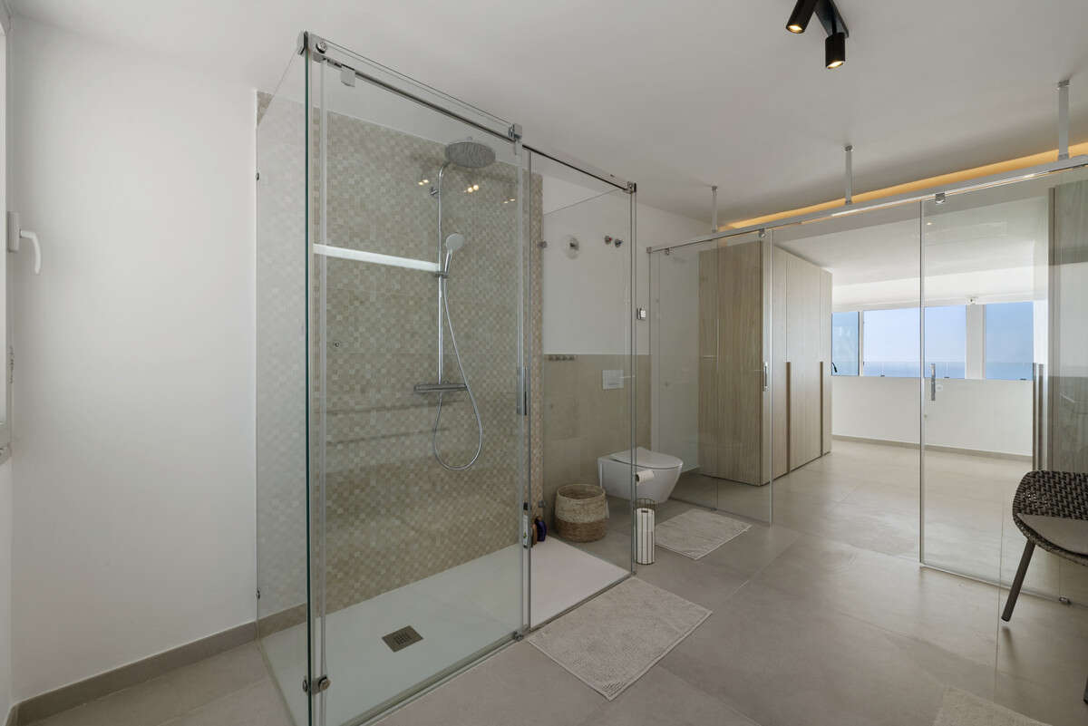 The upper floor is dedicated to the master suite, featuring a dressing area, a large en-suite bathroom, a private sitting and office space, and access to a private upper terrace boasting uninterrupted sea views and the beautiful Stupa. Further features include a private storage room, and two allocated underground parking spaces. The property comfortably balances comfort, style, and security, making it an outstanding choice for both as a full-time residence or luxury holiday home close to the beach, schools, shops, and transport links.