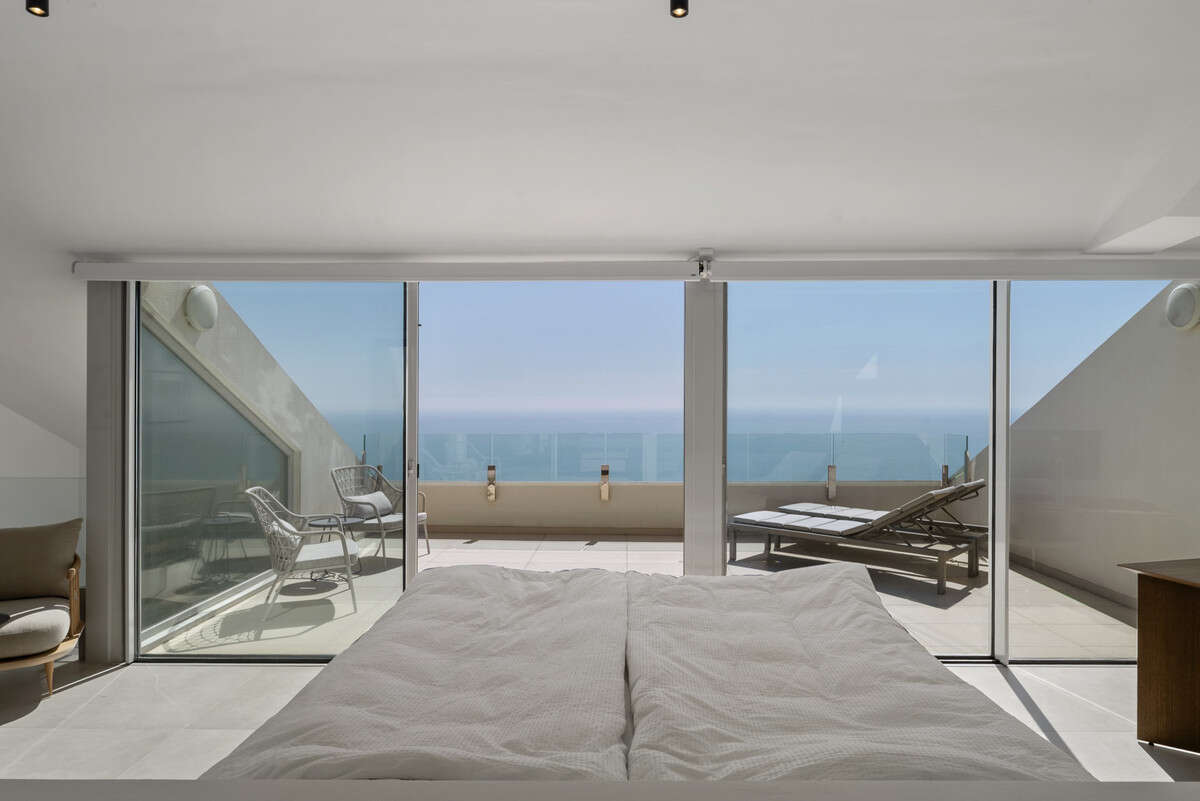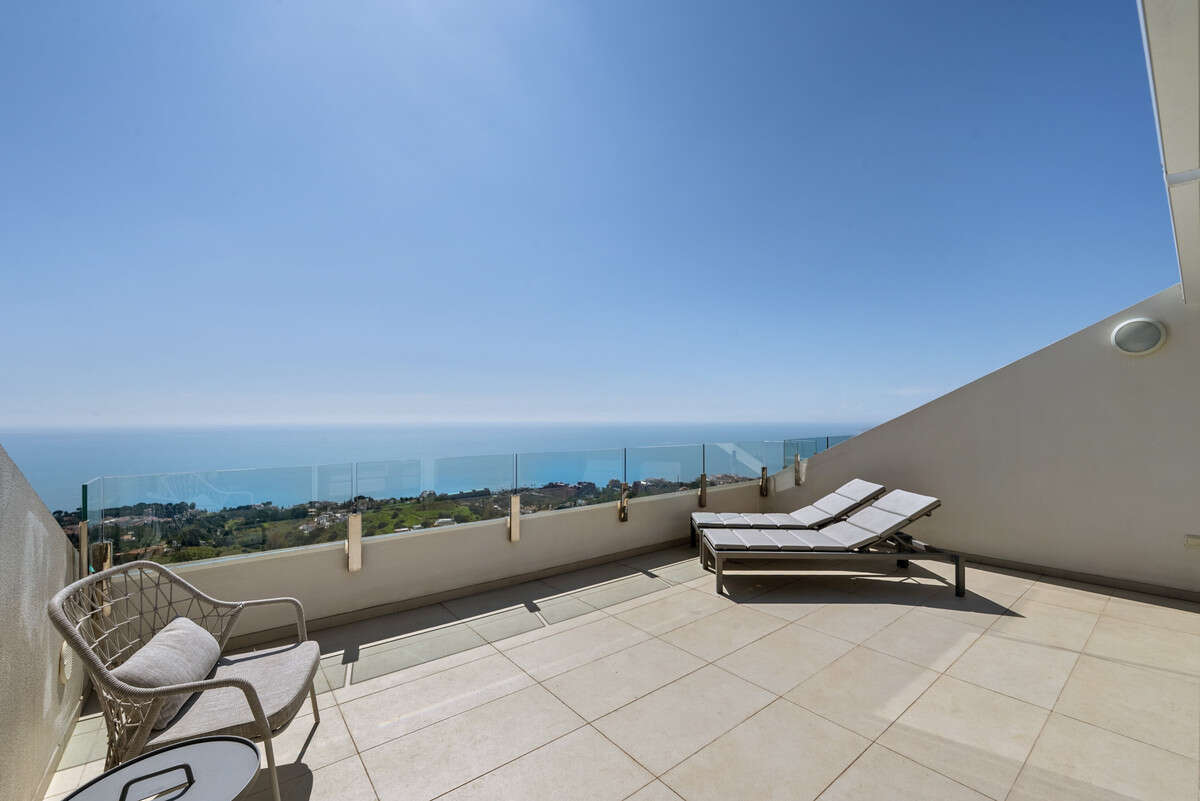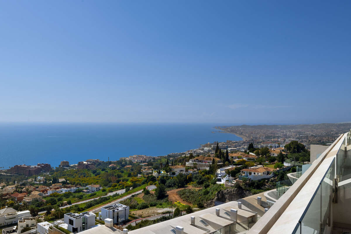 The accommodation is distributed across two floors. The entrance level comprises two double bedrooms with fitted wardrobes, sharing a contemporary bathroom, together with a stylish open-plan kitchen equipped with high-quality fittings, a spacious living room and dining area, all leading directly onto the main covered terrace. This level provides an ideal setting for entertaining and relaxation, with breathtaking panoramic views over the Mediterranean Sea and the picturesque shoreline of Benalmádena and Fuengirola.