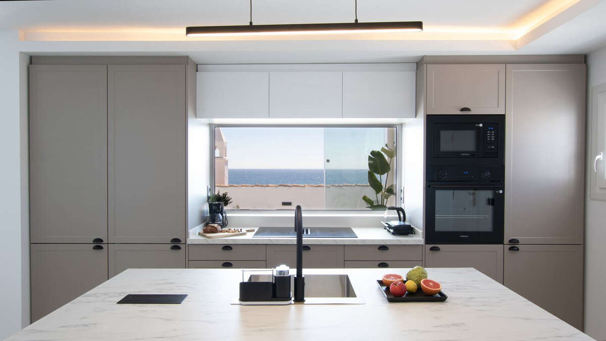 The apartment is a corner penthouse on the beachfront in Calahonda, Mijas Costa, province of Málaga. Completely renovated, without leaving a single detail to chance, the apartment has a large open kitchen, more than 4 meters long and with a large island. All appliances are new, there is a washing machine, dryer, dishwasher, refrigerator, induction hob, microwave, toaster, blender, coffee maker, etc. Fully stocked with a large selection of plates, bowls, glasses, mugs, etc. The kitchen has a lot of light since it has 2 windows, both with views of the sea and the beach. The living room is large and square, with an L-shaped sofa bed, smart TV, sea views from many angles and a door leading to the private terrace. On the terrace of more than 60 m2 there is a covered part, with a large table and 6 chairs, hot and cold air conditioning (split), and the other part of the terrace is without a roof, with a barbecue, sun loungers. and beautiful views of the sea, facing east, south and west.