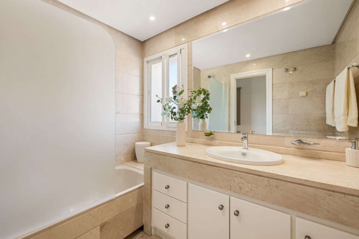 Situated on the first floor, the apartment offers a spacious and bright living room with a fireplace and access to the terrace boasting a SW orientation and sea views.
