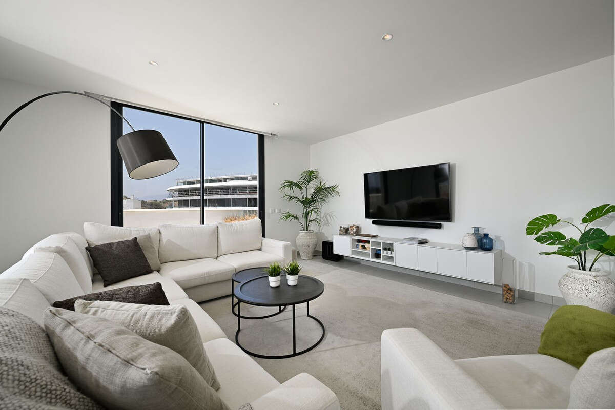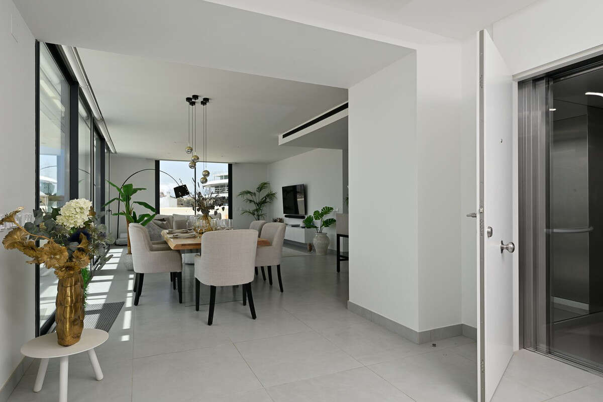 A private elevator from the garage whisks you directly to your front door, where a light-filled, open-plan living and dining space welcomes you. The sleek, fully equipped kitchen features premium appliances and a separate utility room for added convenience. Floor-to-ceiling glass doors lead onto an expansive terrace, where you can relax or entertain while enjoying open views of the manicured gardens, shimmering pools, and the Mediterranean Sea.