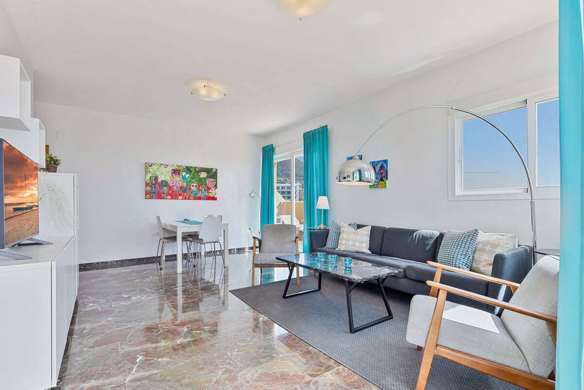 The penthouse is in good condition and is being sold fully furnished. There is also a communal garden with a swimming pool.