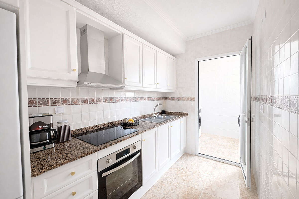 Inside, the home features two spacious bedrooms with built-in wardrobes and a fully renovated bathroom finished with high-quality materials. The bright living area flows naturally into a glazed balcony, which extends the living space and offers calming views over the communal pool, lush gardens, and the sea in the distance. The modern kitchen is fully equipped with new appliances, including an induction hob and oven, and is complemented by a practical patio area with integrated laundry space.