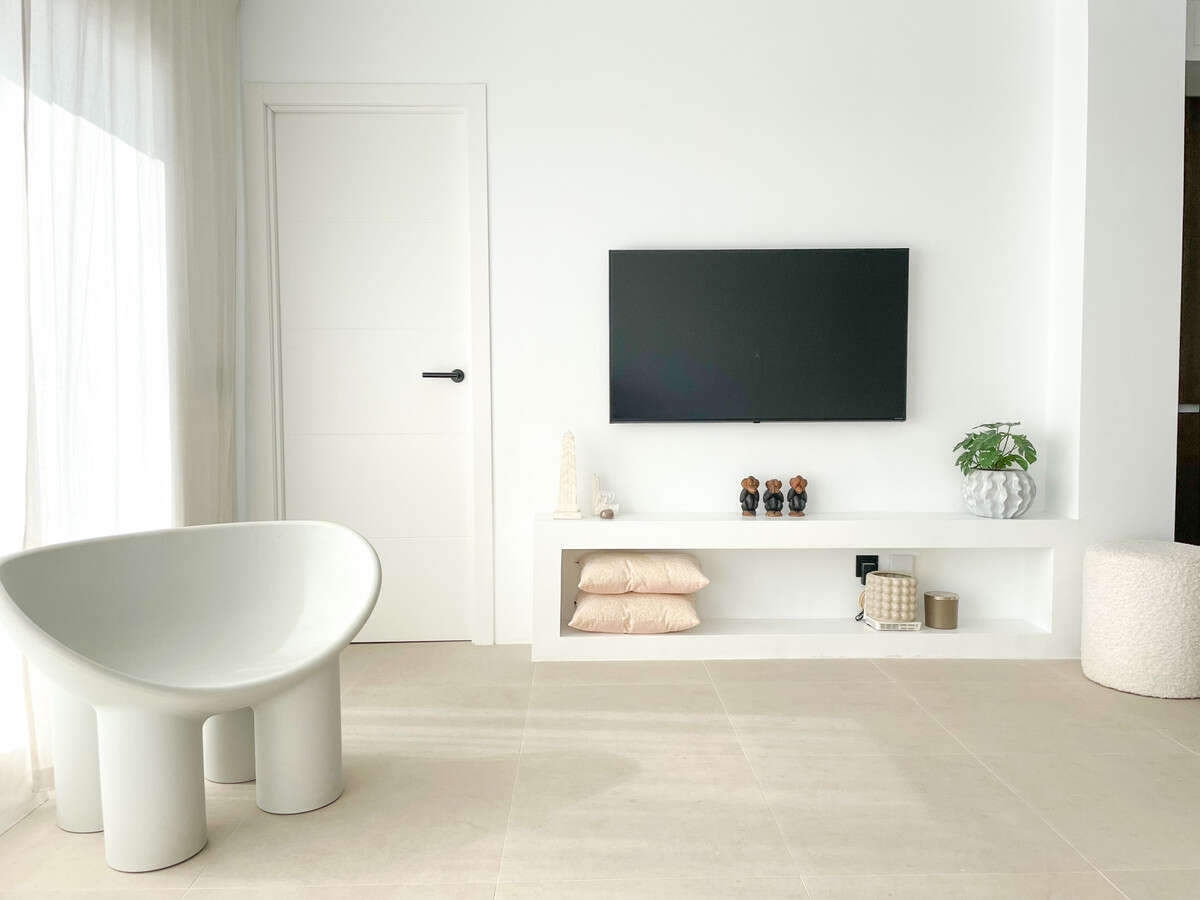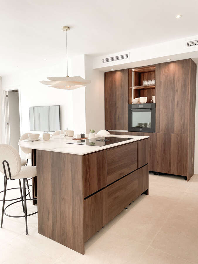 The custom kitchen features a nicely contoured island and top-of-the-line Bertazzoni appliances. The bathroom walls and outdoor areas are covered with 60x60 beige porcelain tiles, which are used throughout the design to provide coherence. The two bathrooms' sleek black features and skylights give them the ideal modern touch, and you can truly live comfortably in the sun here.