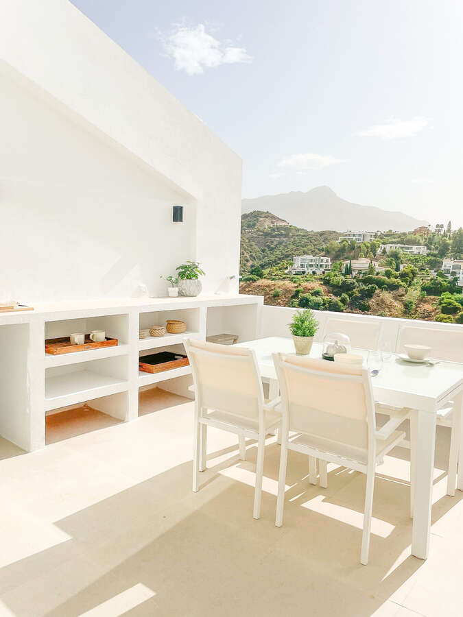The terrace has a dining table, plenty of storage, and a bathroom. It also gets morning and midday light. The sun will be shining all day long as you go onto the roof terrace, so why not take advantage of the outdoor shower or the raised sun deck to cool off? Evenings can be spent either by the barbecue/outdoor kitchen area or in front of the custom fire table.