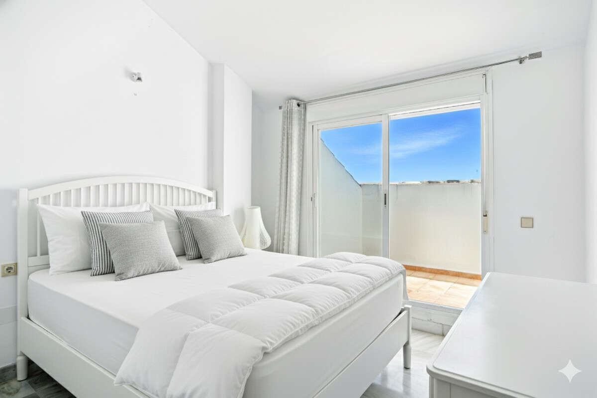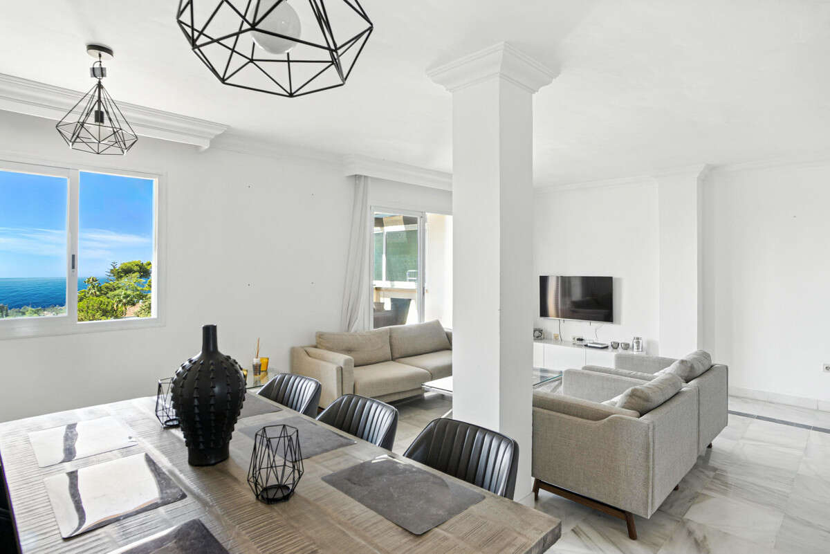 Beautiful south-facing apartment with magnificent sea views, located in the sought-after community of Pinos de Nagüeles, in Marbella's prestigious Golden Mile. Within walking distance to the beach, shops, restaurants, cafés, and the promenade, and just a short drive to golf courses and international schools. This charming corner property enjoys a prime position and consists of three bedrooms and three bathrooms, with the master bedroom en suite. The two upstairs bedrooms each have their own private terrace. There is also a bright and spacious living-dining area and a main private terrace, perfect for relaxing or dining outdoors. The kitchen is fully equipped and designed for functionality, complete with a separate laundry room. The property offers the perfect combination of comfort and location, set within a gated development featuring 24-hour security, beautifully maintained gardens, a paddle/tennis court, clubhouse, and a large communal swimming pool. Additional features include marble flooring, air conditioning, an elevator, an underground parking space conveniently close to the lift, and a bus stop just a few hundred metres from the apartment. The community offers a peaceful yet well-connected environment.