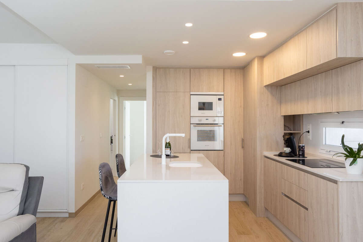 Apartment with balcony, roof terrace and shared pool. Garage space. Stylish apartment with an attractive location in Villamartin near the golf course. The apartment has two bedrooms, two bathrooms and an open plan living room and kitchen, there is also a balcony and a sunny roof terrace. The apartment, which was built in 2022, is modern with an inviting feel. lightly furnished surfaces and pleasant light flows.