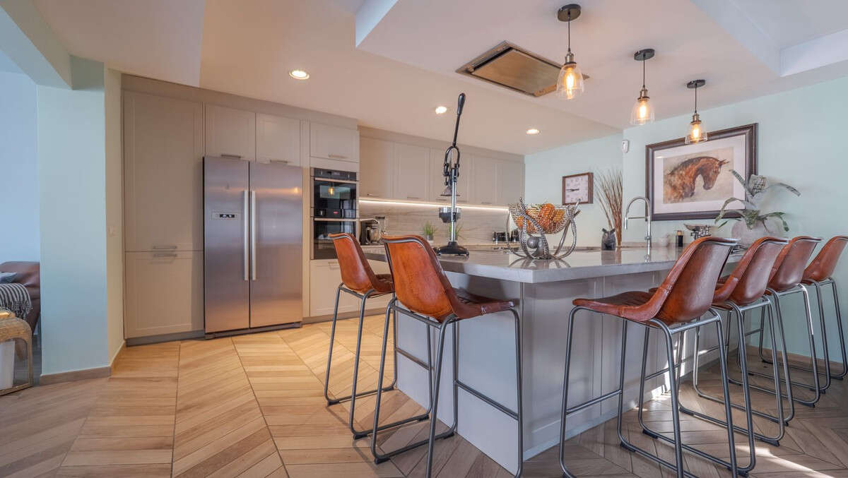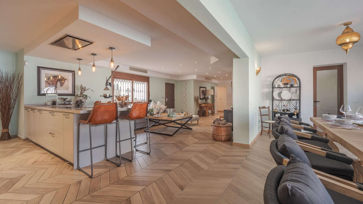 The fully renovated main residence spans 199 m² and blends timeless Mediterranean character with contemporary luxury. The expansive living room features a cozy wood-burning stove and flows into a modern open-plan kitchen with a generous cooking island and a ceiling-integrated extractor fan. The dining area, with seating for 12 guests, is perfect for entertaining and has a guest toilet nearby. A large accordion-style sliding door connects seamlessly with the landscaped pool garden, inviting outdoor living and relaxation.