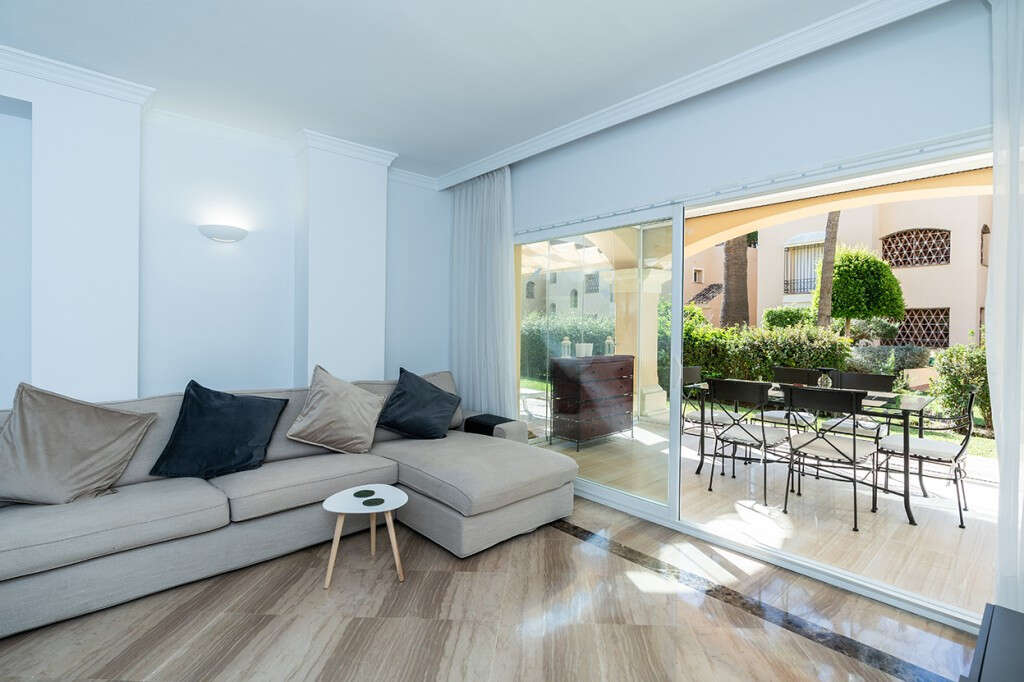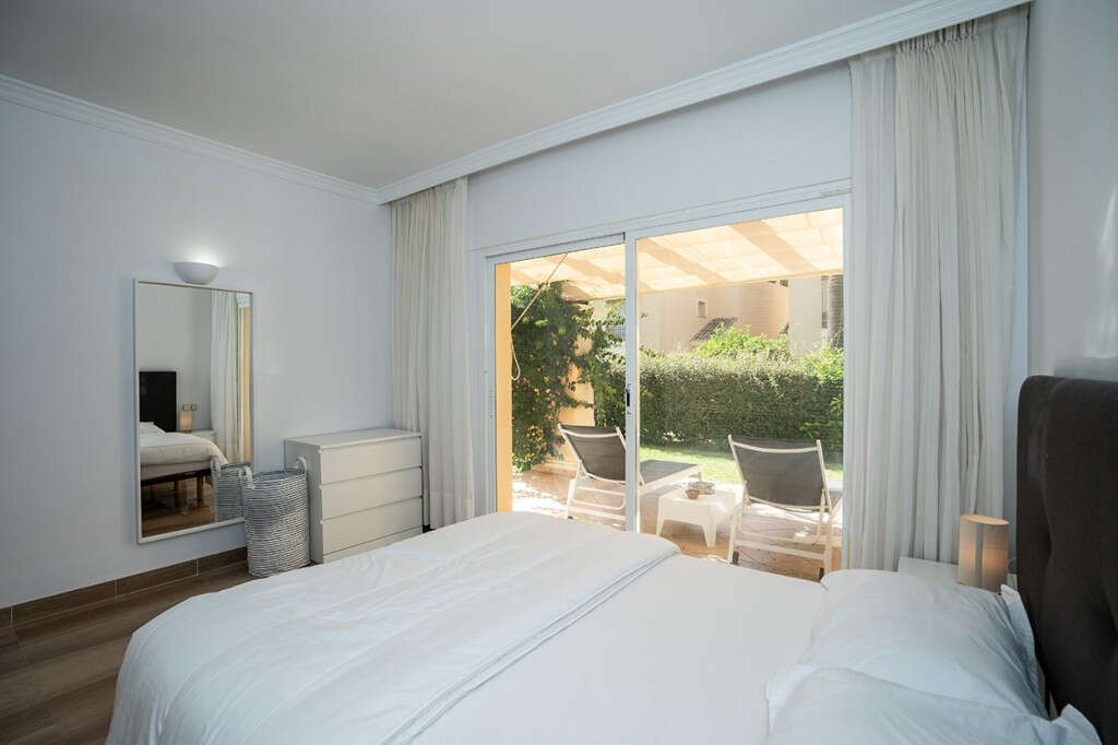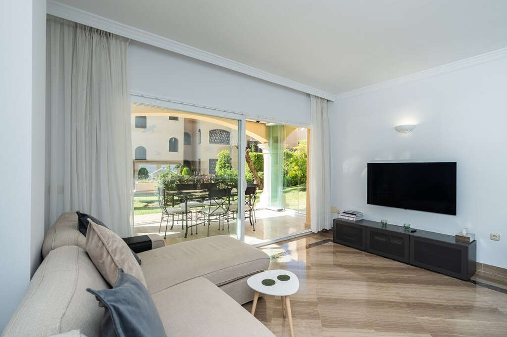 Apartmento con jardin muy amplio y luminoso, completamente reformado en el complejo en Elviria en Marbella Este. Se encuentra a pocos minutos caminando de la playa así como de restaurantes, supermercados y tiendas. El apartamento ofrece en una sola planta tres dormitorios, dos cuartos de baño, uno de ello en-suite, un salón espacioso con acceso a la terraza cubierta y jardín. Complejo cerrado con cuatro zonas de piscinas y con cuidados jardines. El apartamento está equipado con aire acondicionado frío y calor, suelos de marmol, cuartos de baño de marmol y con suelo radiante, ventanas con doble acristalamiento y con plaza de parking, trastero y ascensor.