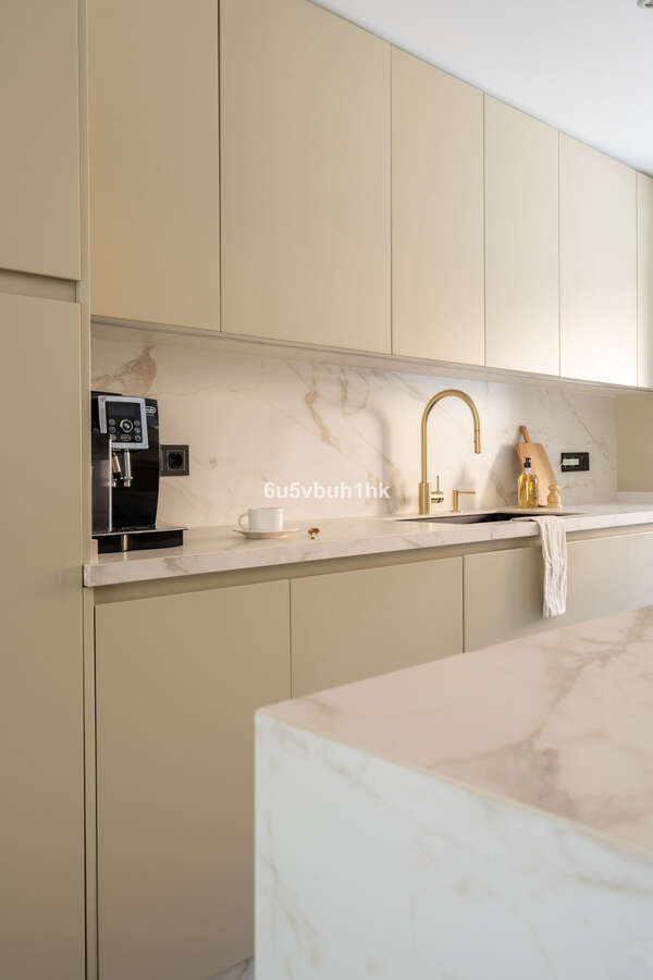 La impresionante puerta principal da paso a una cocina-salón abierto que da a un patio privado con vistas directas al mar y una puerta de acceso a la zona comunitaria. La cocina está equipada con electrodomésticos modernos y es amplia, con mucho espacio de almacenamiento.