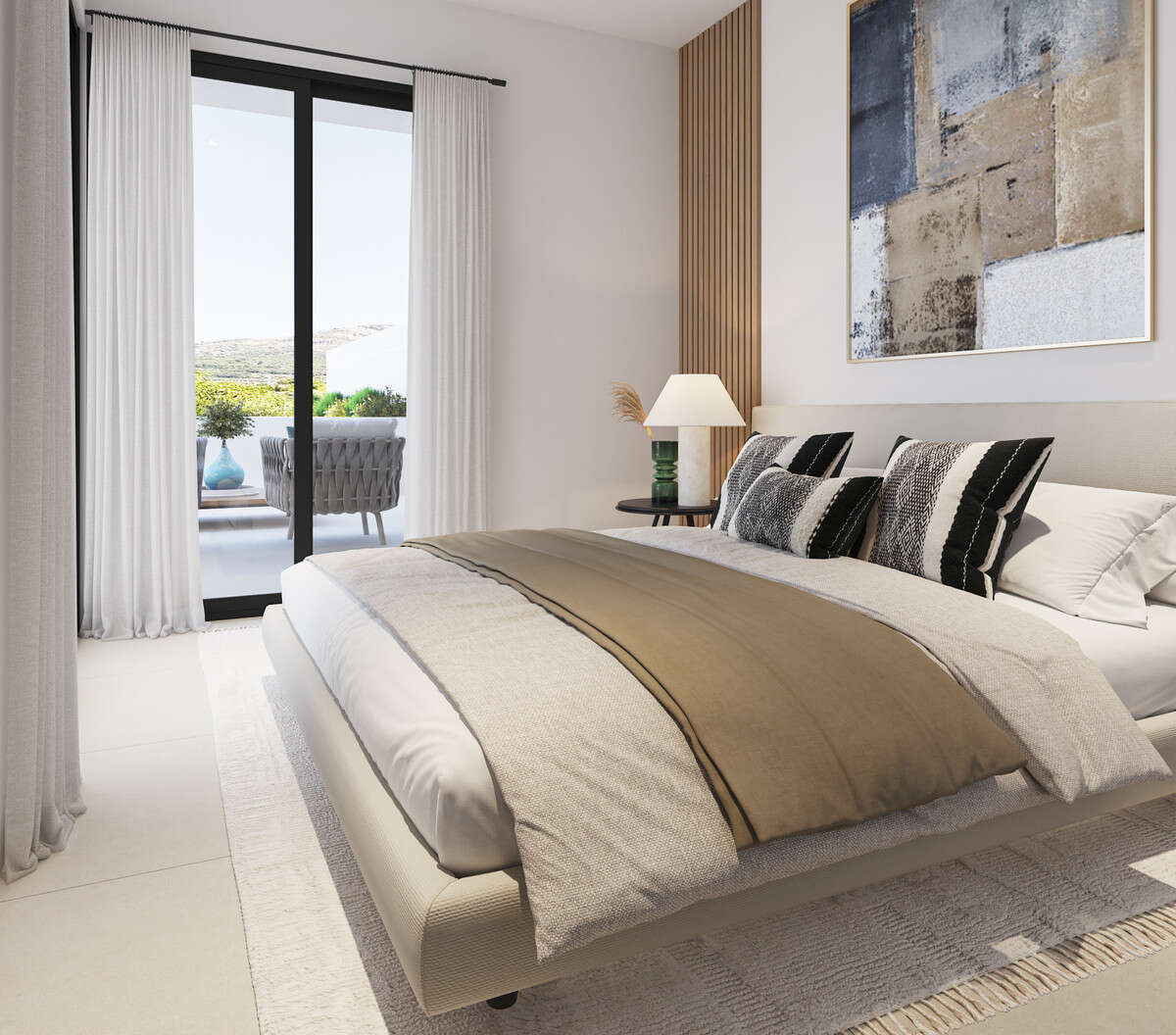 1-, 2-, and 3-bedroom apartments, predominantly 2-bedroom, are designed with spacious living rooms and open kitchens, large windows, and direct access to south-facing terraces that fill every space with natural light. Master bedrooms offer generous space and high-quality finishes.