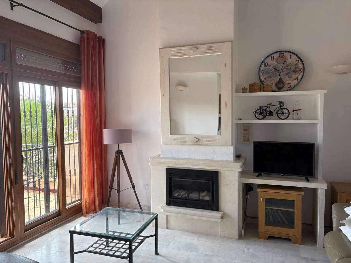 We are pleased to present this top floor apartment on the La Finca Golf Resort, Algorfa. The property is on the top floor and has an open plan layout with a lounge diner, and American style, fully equipped kitchen. The lounge has a feature fireplace and patio doors that give access to a terrace, perfect for enjoying your morning coffee. Stairs from the terrace lead up to a large private solarium with incredible views of the countryside and mountains.