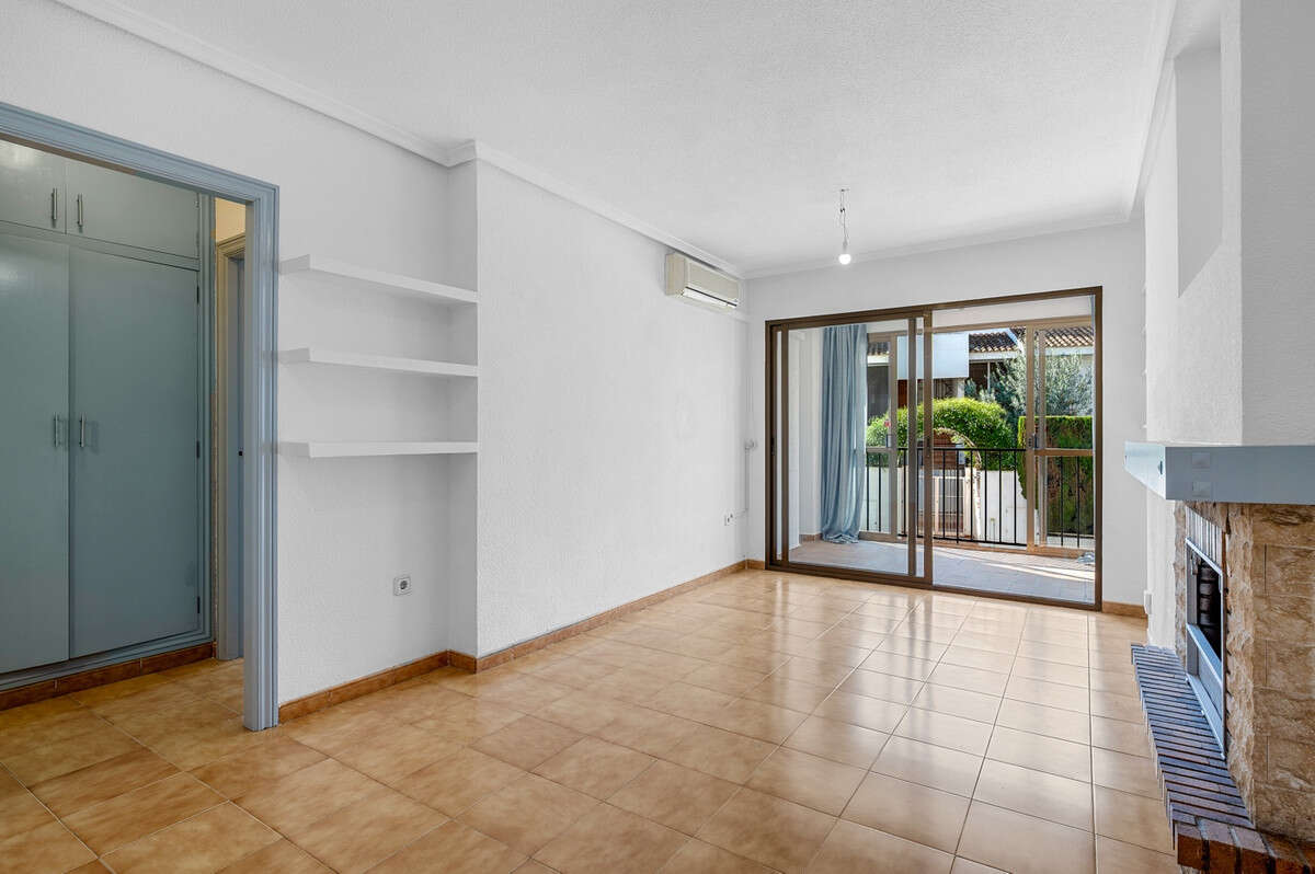 Situated on the ground floor, the apartment features a bright living room with an open-plan kitchen, a bedroom, a balcony accessible directly from the living area, and practical built-in utility spaces. The interior is in excellent condition, equipped with air conditioning and a delightful fireplace that adds a touch of warmth and character. It is sold unfurnished, allowing you to design and decorate it entirely to your own taste.