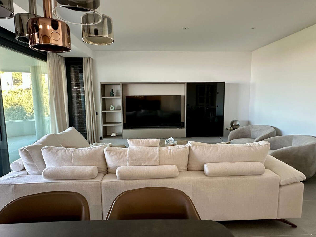 The apartment boasts a generous built area of 112m² and features 3 well-proportioned bedrooms and 2 bathrooms, including a luxurious en-suite master bedroom. The living spaces are thoughtfully designed, with an open plan, fully fitted and equipped kitchen that flows seamlessly into a spacious dining room and living room. Both rooms open onto a private covered terrace, presenting panoramic views of the sea, mountains, countryside, gardens, and communal pool. A stunning terrace of 22m2 with panoramic views. Double glazing, air conditioning, and fitted wardrobes add to the comfort and practicality of the home.